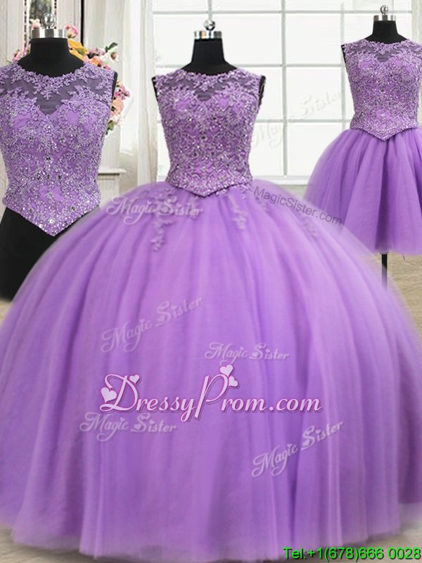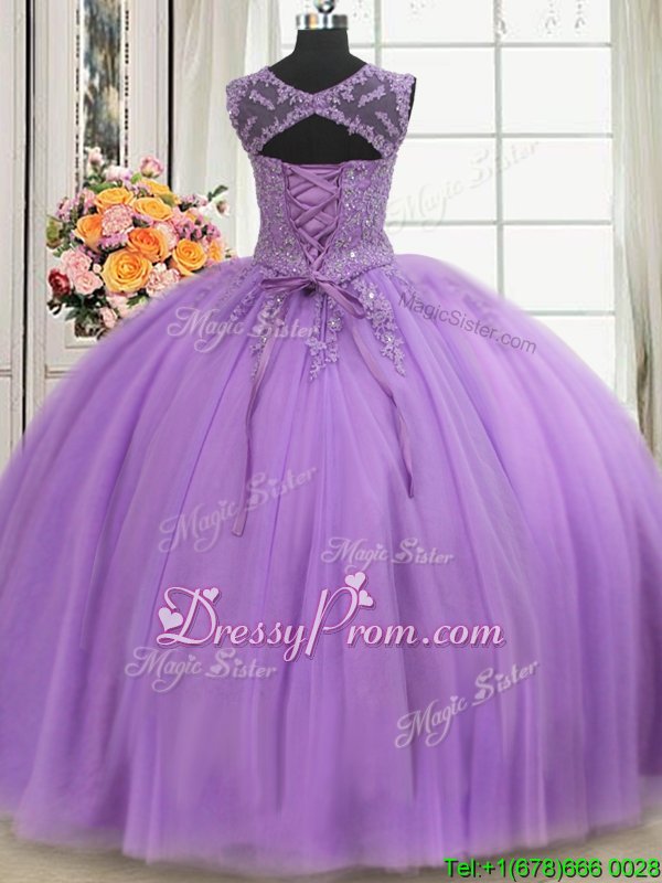 Neckline : ScoopShown Color : LilacSilhouette : Ball GownsSleeve Length : sleevelessHemline : floor lengthBack Detail : Lace upFabric : TulleEmbellishment : Beading,AppliquesOccasion : Military Ball,Sweet 16,QuinceaneraSeason : Spring,Summer,Fall,Winter
