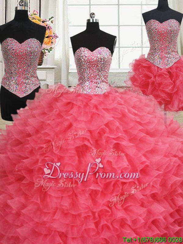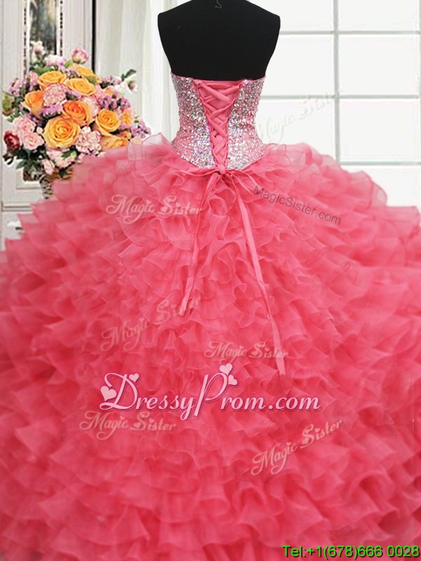 Discount Organza Sweetheart Sleeveless Lace Up Beading and Ruffles Quinceanera Gown inCoral Red