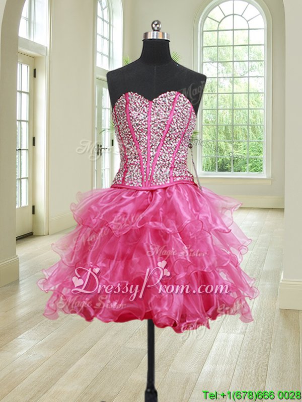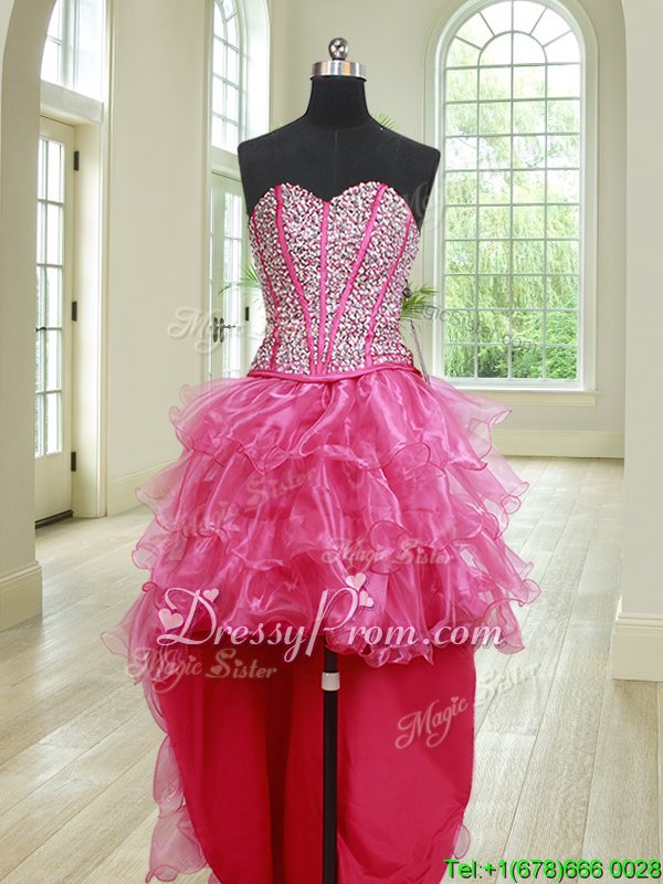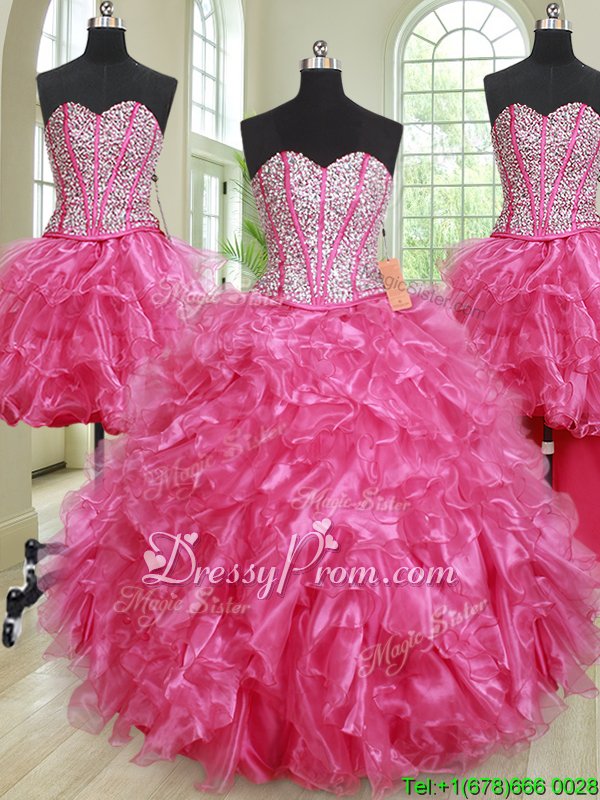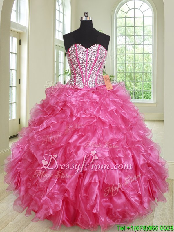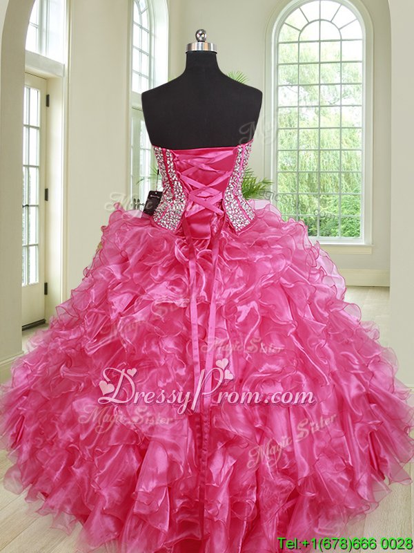 Perfect Hot Pink Organza Lace Up Sweet 16 Quinceanera Dress Sleeveless Floor Length Beading and Ruffles