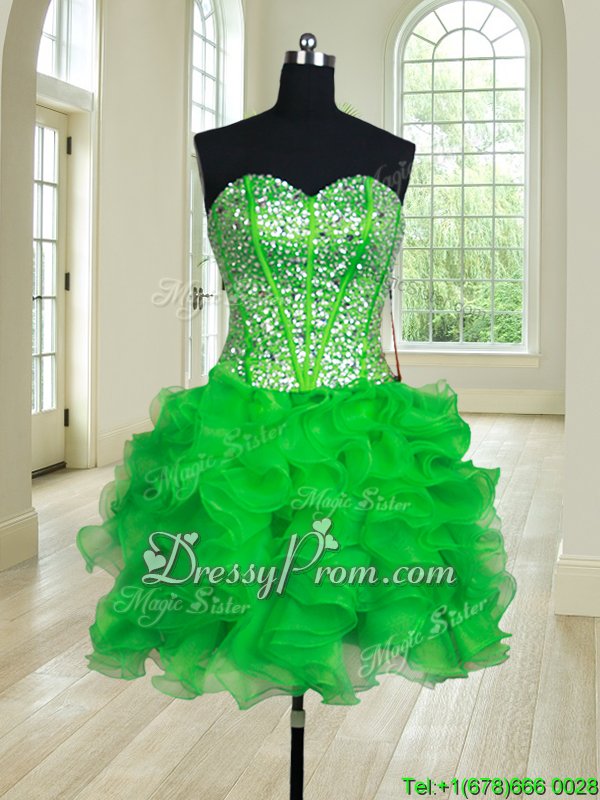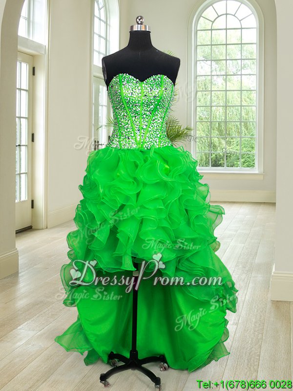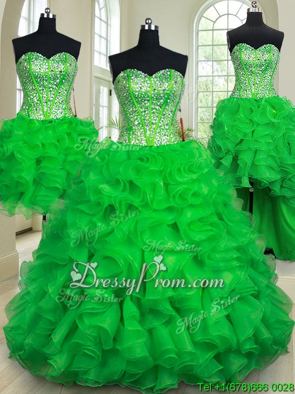 Neckline : SweetheartShown Color : GreenSilhouette : Ball GownsSleeve Length : sleevelessHemline : floor lengthBack Detail : Lace upFabric : OrganzaEmbellishment : Beading,RufflesOccasion : Military Ball,Sweet 16,QuinceaneraSeason : Spring,Summer,Fall,Winter