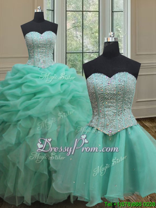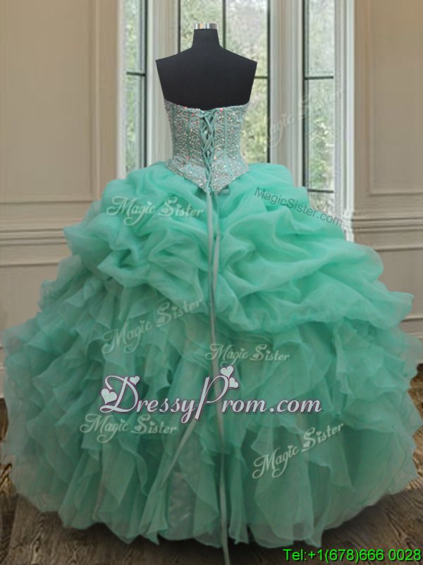 Neckline : SweetheartShown Color : TurquoiseSilhouette : Ball GownsSleeve Length : sleevelessHemline : floor lengthBack Detail : Lace upFabric : OrganzaEmbellishment : Beading,Ruffles,Pick UpsOccasion : Military Ball,Sweet 16,QuinceaneraSeason : Spring,Summer,Fall,Winter
