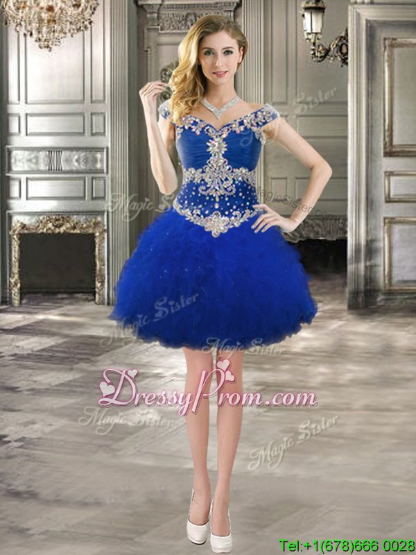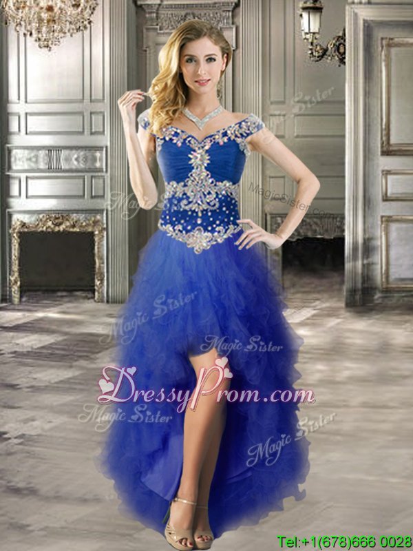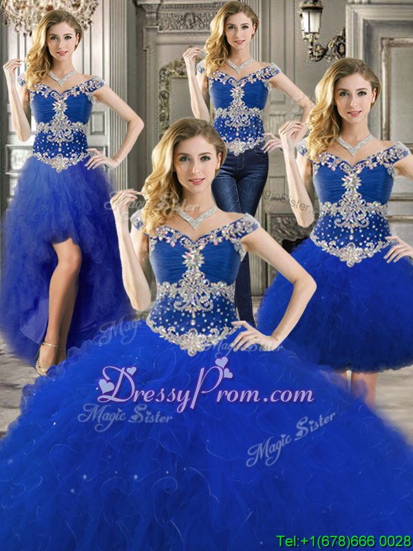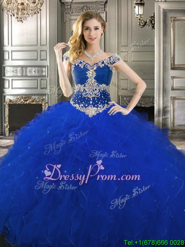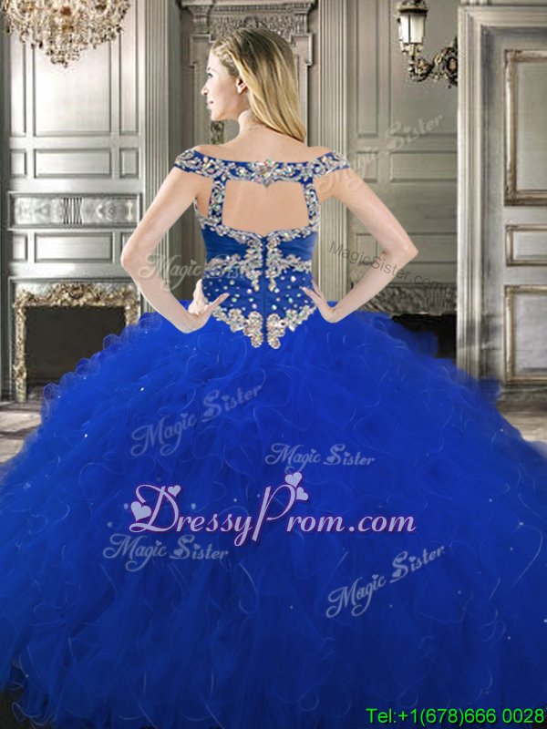 Neckline : Off the shoulder Shown Color : Royal Blue Silhouette : Ball Gowns Sleeve Length : sleeveless Hemline : floor length Back Detail : Zipper Fabric : Tulle Embellishment : Beading,Ruffles Occasion : Military Ball,Sweet 16,Quinceanera Season : Spring,Summer,Fall,Winter