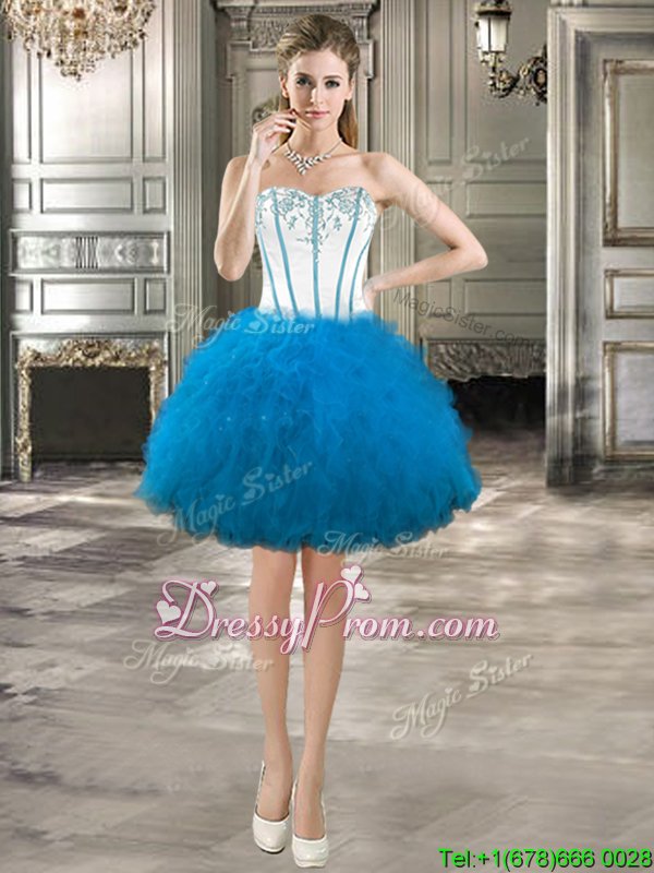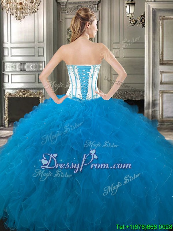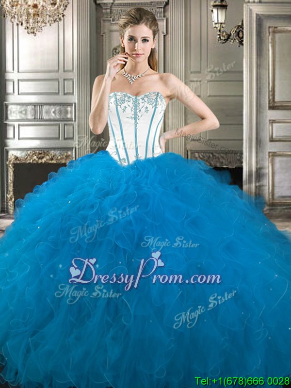 Neckline : SweetheartShown Color : White,Blue And WhiteSilhouette : Ball GownsSleeve Length : sleevelessHemline : floor lengthBack Detail : Lace upFabric : TulleEmbellishment : Embroidery,RufflesOccasion : Military Ball,Sweet 16,QuinceaneraSeason : Spring,Summer,Fall,Winter