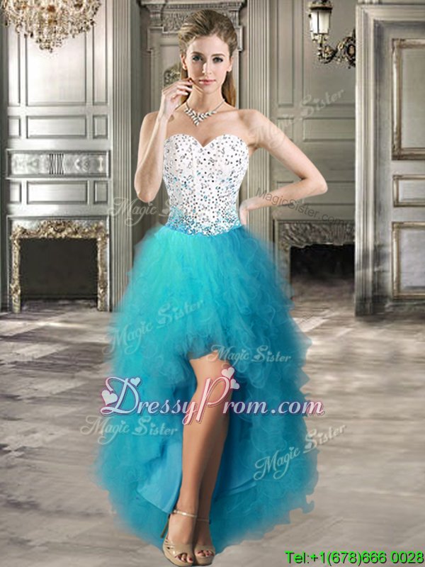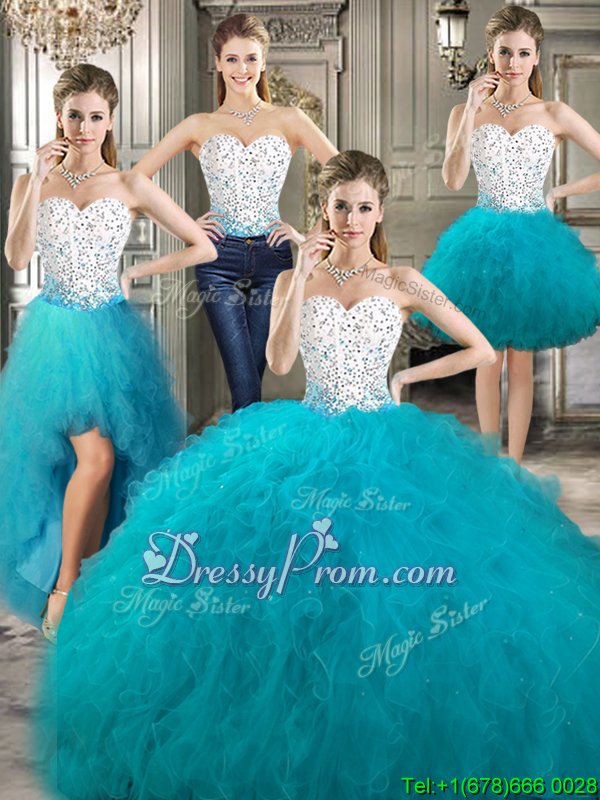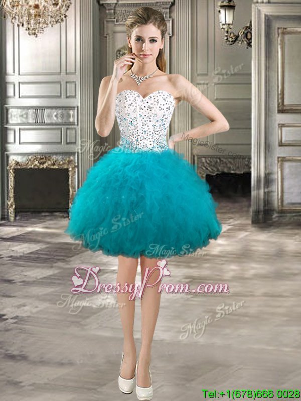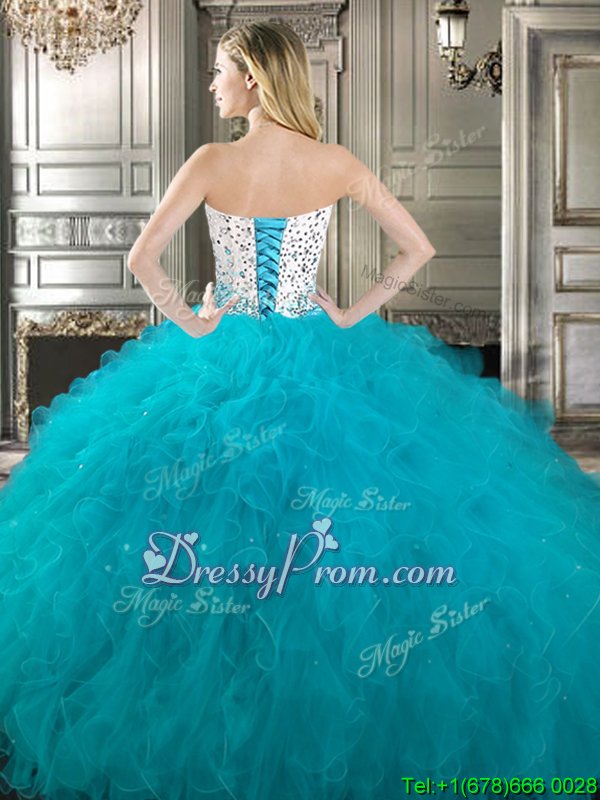 Neckline : SweetheartShown Color : White,Teal Silhouette : Ball GownsSleeve Length : sleevelessHemline : floor lengthBack Detail : Lace upFabric : TulleEmbellishment : Beading,RufflesOccasion : Military Ball,Sweet 16,QuinceaneraSeason : Spring,Summer,Winter