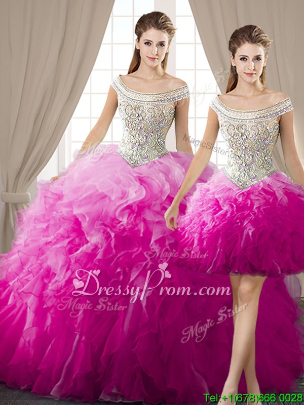 Neckline : Off the shoulderShown Color : Hot PinkSilhouette : Ball GownsSleeve Length : sleevelessHemline : floor lengthBack Detail : Lace upFabric : OrganzaEmbellishment : Beading,RufflesOccasion : Military Ball,Sweet 16,QuinceaneraSeason : Spring,Summer,Fall,Winter