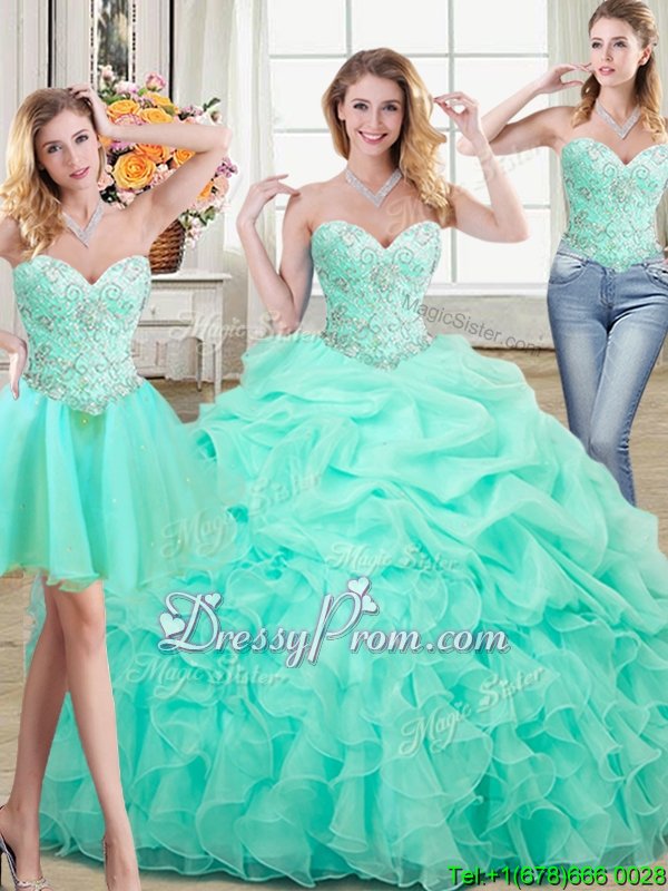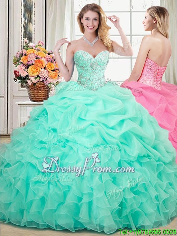 Neckline : SweetheartShown Color : Apple GreenSilhouette : Ball GownsSleeve Length : sleevelessHemline : floor lengthBack Detail : Lace upFabric : OrganzaEmbellishment : Beading,Ruffles,Pick UpsOccasion : Military Ball,Sweet 16,QuinceaneraSeason : Spring,Summer,Fall,Winter