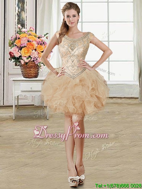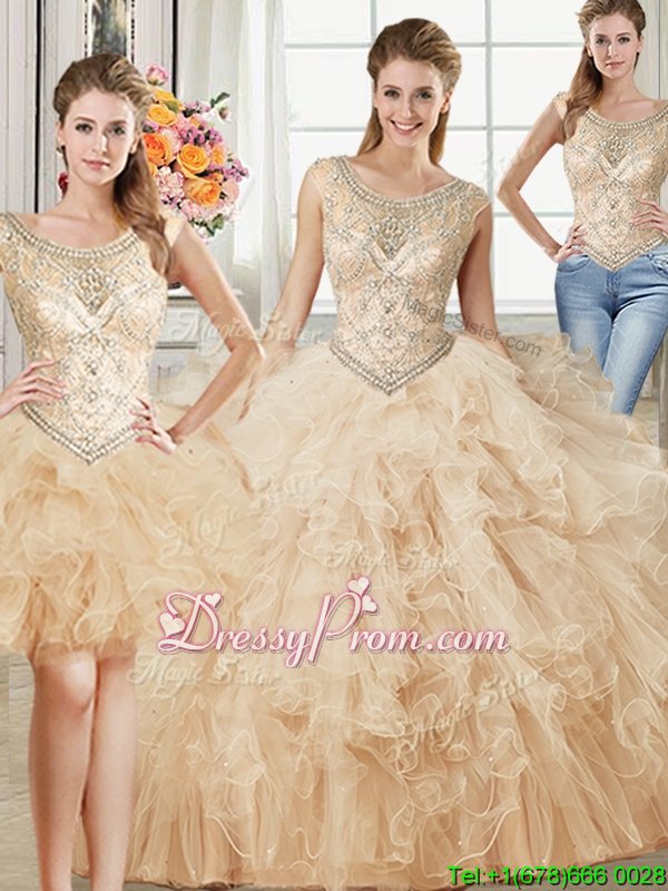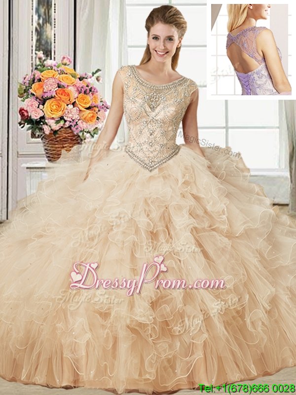 Neckline : ScoopShown Color : ChampagneSilhouette : Ball GownsSleeve Length : sleevelessHemline : floor lengthBack Detail : Lace upFabric : TulleEmbellishment : Beading,RufflesOccasion : Military Ball,Sweet 16,QuinceaneraSeason : Spring,Summer,Fall,Winter