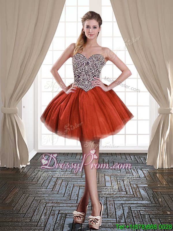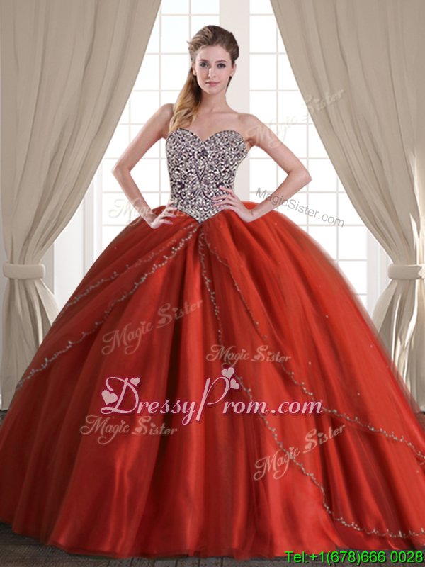 Neckline : SweetheartShown Color : Rust RedSilhouette : Ball GownsSleeve Length : sleevelessHemline : with trainBack Detail : Lace upFabric : TulleEmbellishment : BeadingOccasion : Military Ball,Sweet 16,QuinceaneraSeason : Spring,Summer,Fall,Winter