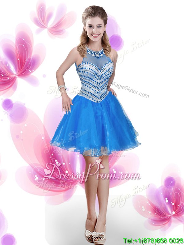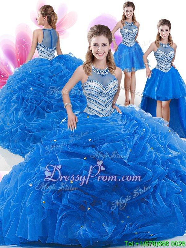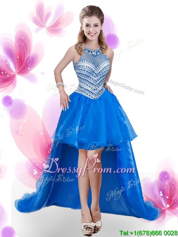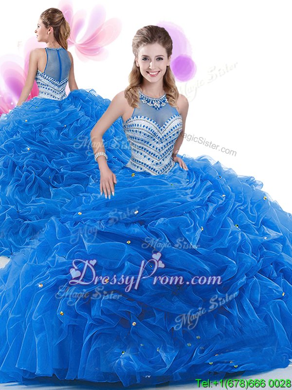 Neckline : High-neckShown Color : Royal BlueSilhouette : Ball GownsSleeve Length : sleevelessHemline : floor lengthBack Detail : ZipperFabric : OrganzaEmbellishment : Beading,Pick UpsOccasion : Military Ball,Sweet 16,QuinceaneraSeason : Spring,Summer,Fall,Winter