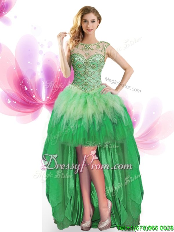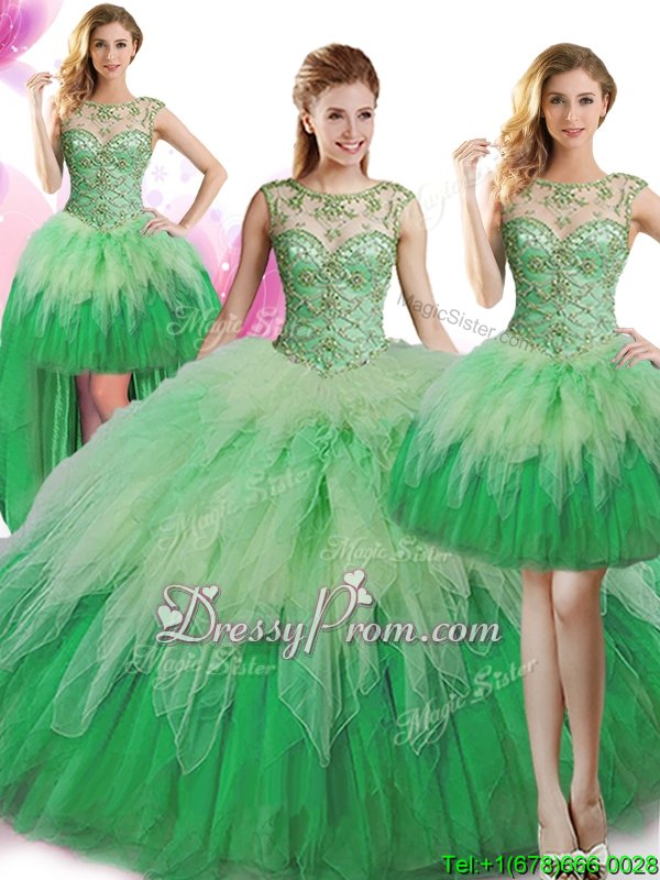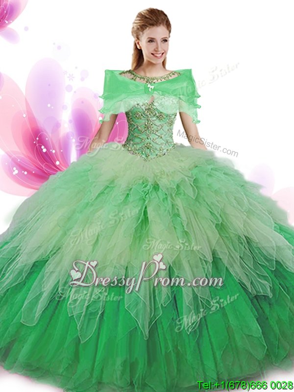 Neckline : ScoopShown Color : GreenSilhouette : Ball GownsSleeve Length : sleevelessHemline : floor lengthBack Detail : Lace upFabric : TulleEmbellishment : Beading,RufflesOccasion : Military Ball,Sweet 16,QuinceaneraSeason : Spring,Summer,Fall,Winter