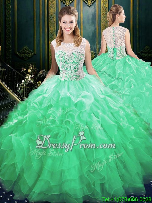 Neckline : ScoopShown Color : TurquoiseSilhouette : Ball GownsSleeve Length : sleevelessHemline : floor lengthBack Detail : Lace upFabric : OrganzaEmbellishment : Lace,RufflesOccasion : Military Ball,Sweet 16,QuinceaneraSeason : Spring,Summer,Fall,Winter