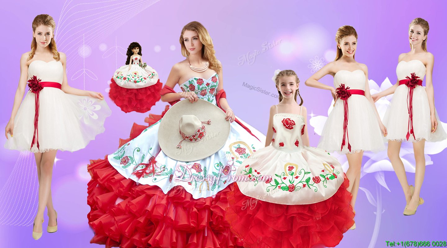 Neckline : SweetheartShown Color : White And Red Silhouette : Ball GownsSleeve Length : sleevelessHemline : floor lengthBack Detail : Lace upFabric : OrganzaEmbellishment : Beading,RufflesOccasion : Sweet 16,QuinceaneraSeason : Spring,Summer,Fall