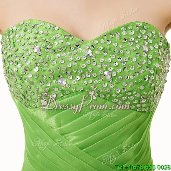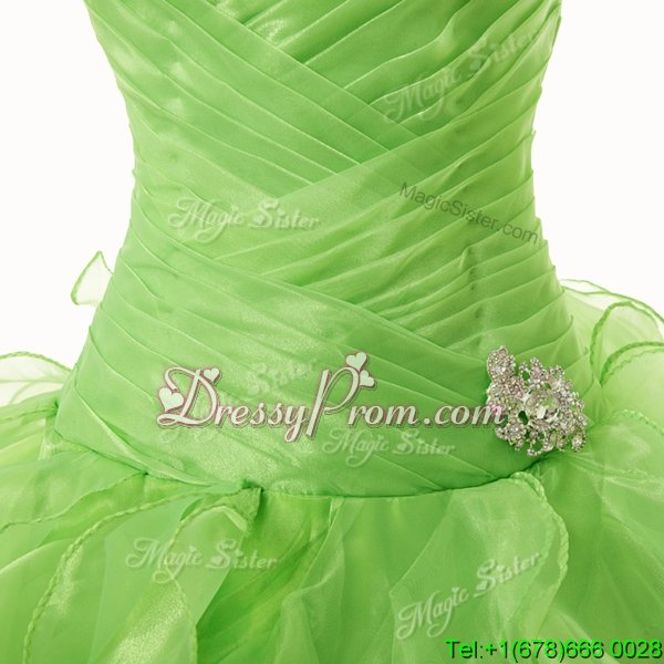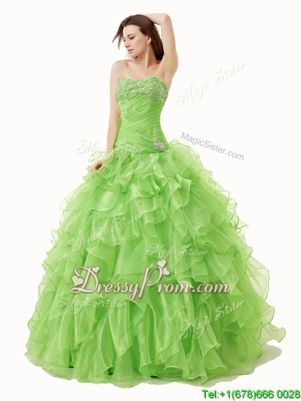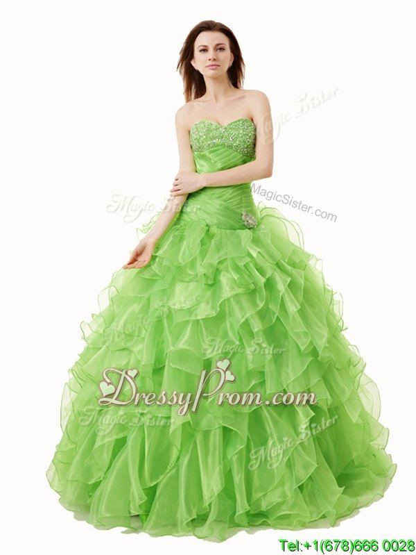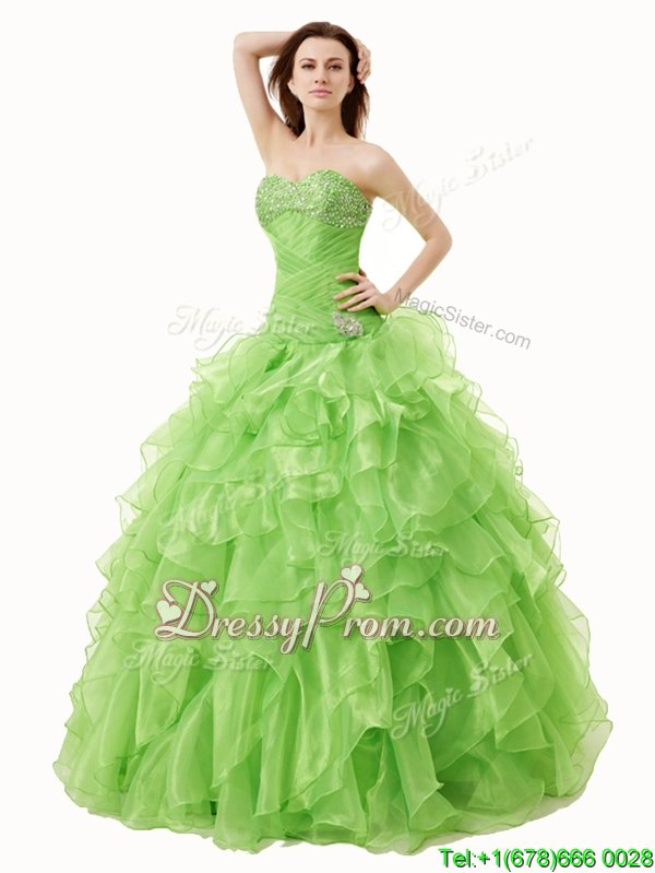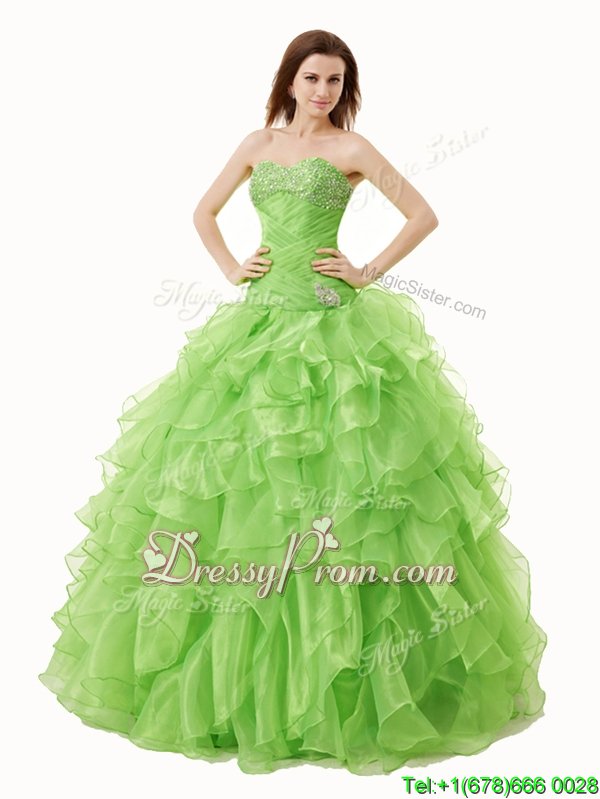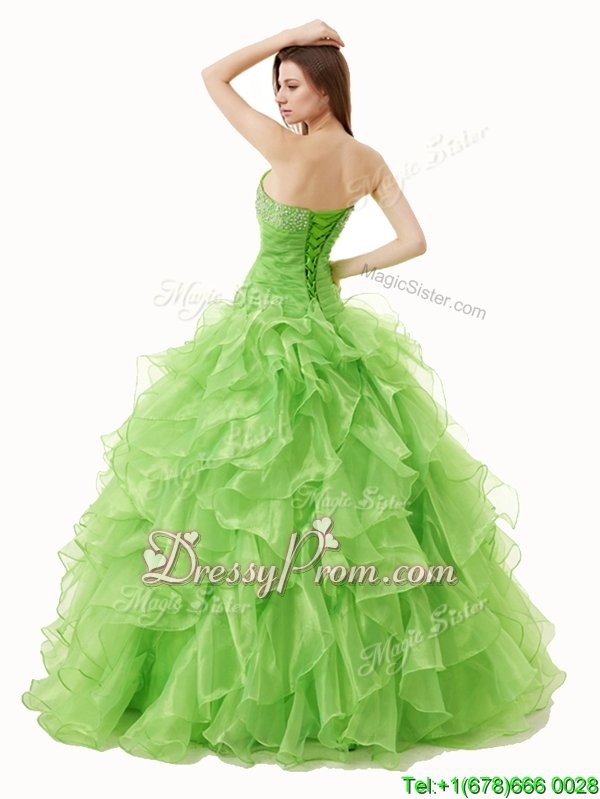 Neckline : SweetheartShown Color : Spring GreenSilhouette : A-lineSleeve Length : sleevelessHemline : floor lengthBack Detail : Lace upFabric : OrganzaEmbellishment : Beading,RufflesOccasion : Military Ball,Sweet 16,QuinceaneraSeason : Spring,Summer,Fall,Winter