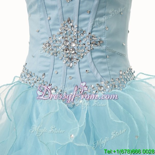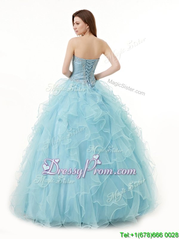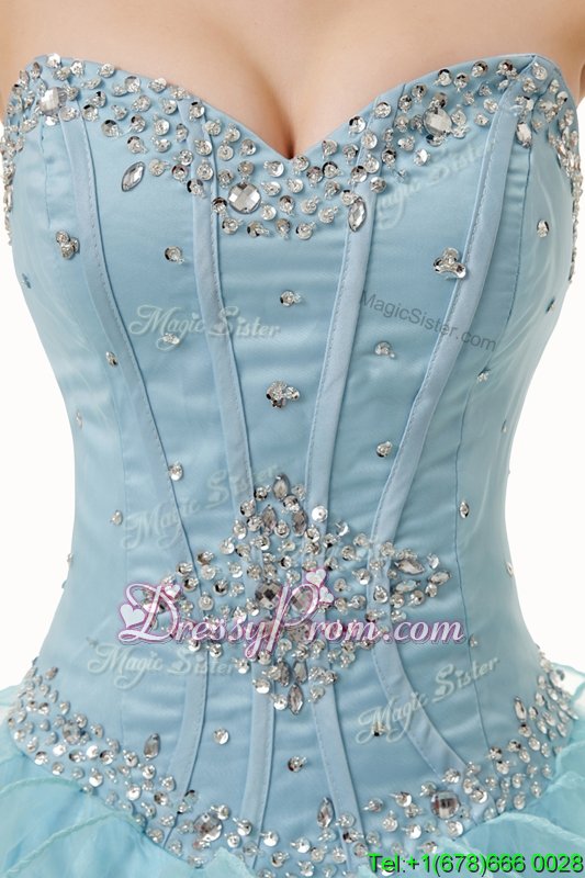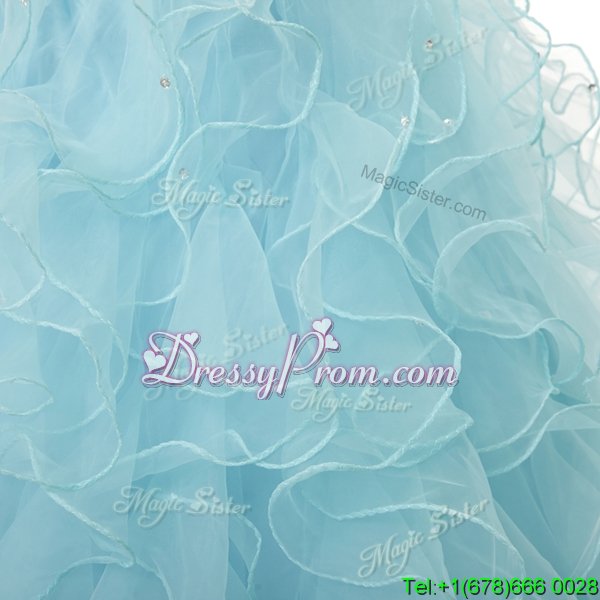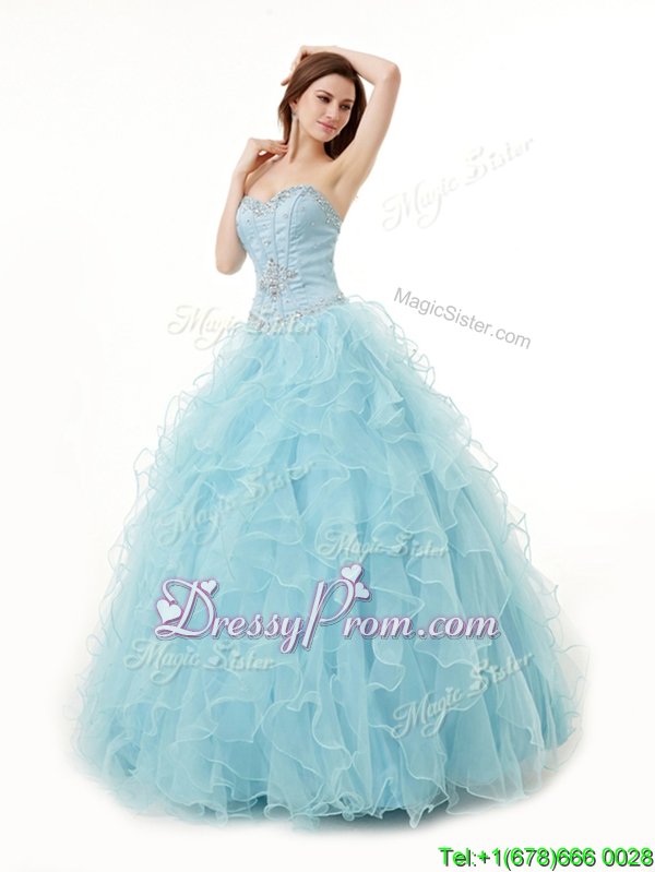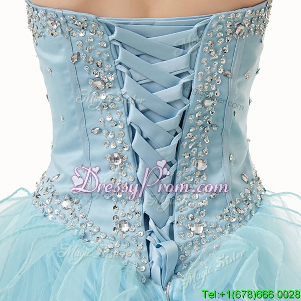 Neckline : SweetheartShown Color : Light BlueSilhouette : A-lineSleeve Length : sleevelessHemline : floor lengthBack Detail : Lace upFabric : OrganzaEmbellishment : Beading,RufflesOccasion : Military Ball,Sweet 16,QuinceaneraSeason : Spring,Summer,Fall,Winter