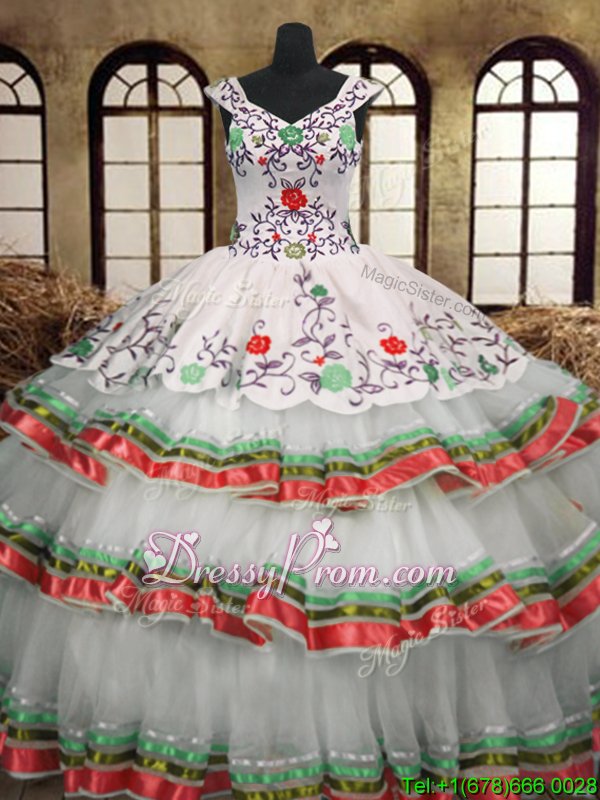 Hot Selling Floor Length Multi-color Quinceanera Dress Organza Sleeveless Spring and Summer and Fall and Winter Embroidery and Ruffled Layers
