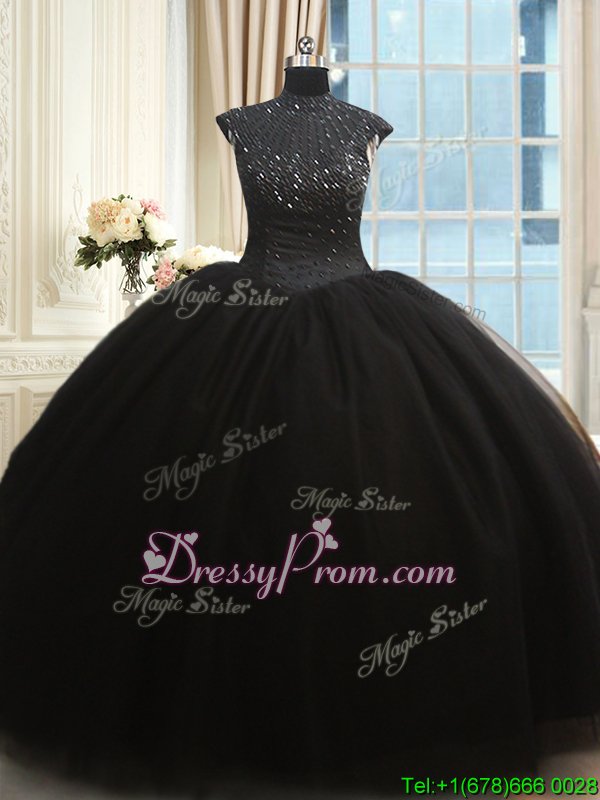 Neckline : High-neckShown Color : BlackSilhouette : Ball GownsSleeve Length : cap sleevesHemline : floor lengthBack Detail : ZipperFabric : TulleEmbellishment : BeadingOccasion : Military Ball,Sweet 16,QuinceaneraSeason : Spring,Summer,Fall,Winter