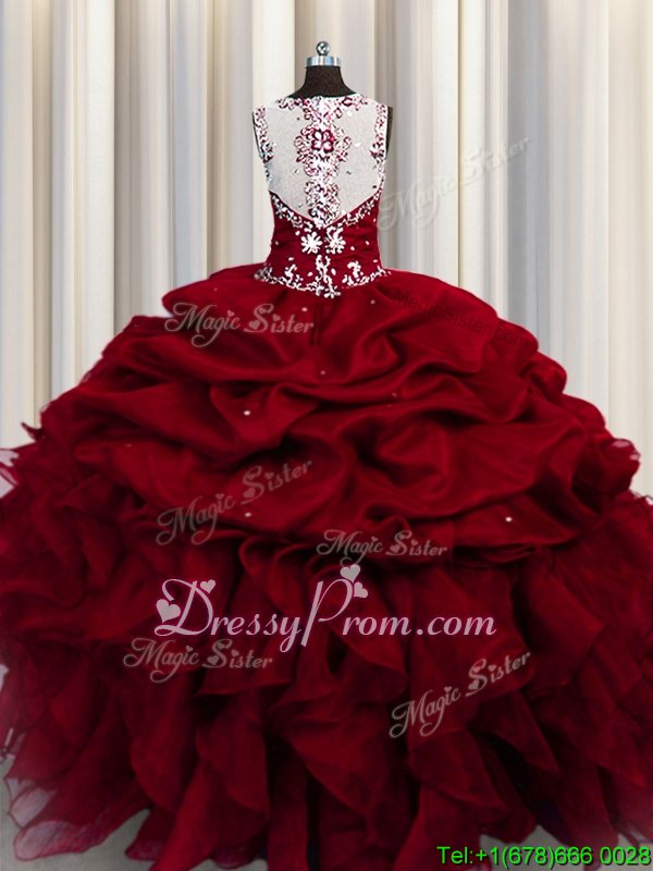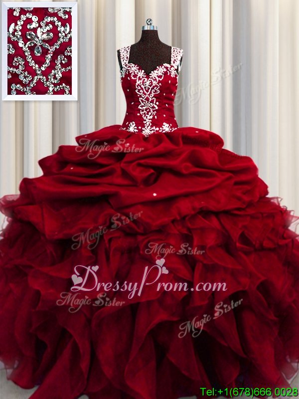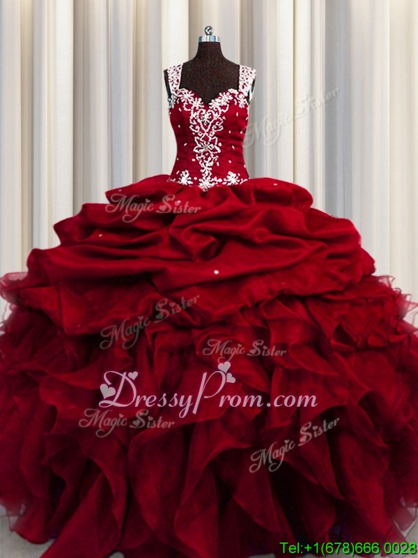 Neckline : StrapsShown Color : Wine RedSilhouette : Ball GownsSleeve Length : sleevelessHemline : floor lengthBack Detail : ZipperFabric : OrganzaEmbellishment : Beading,Ruffles,SequinsOccasion : Military Ball,Sweet 16,QuinceaneraSeason : Spring,Summer,Fall,Winter