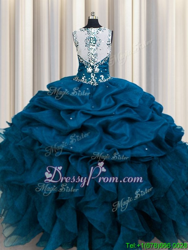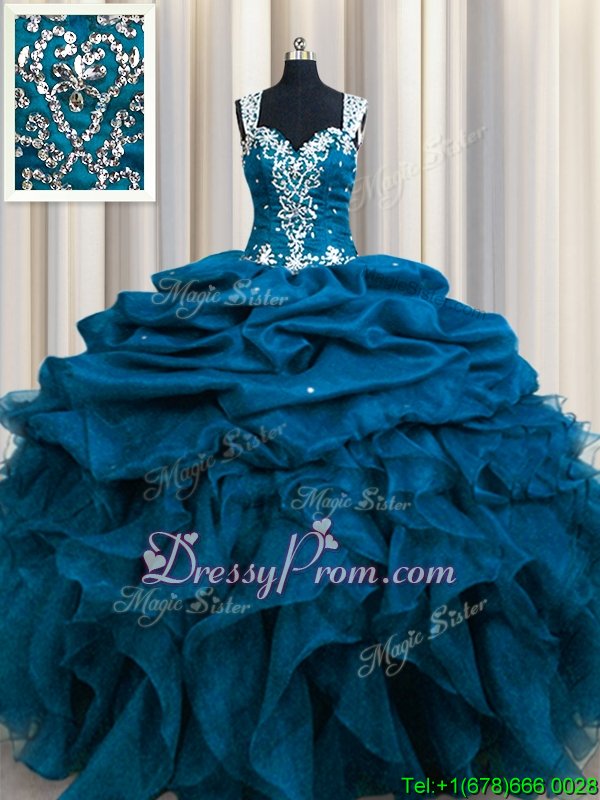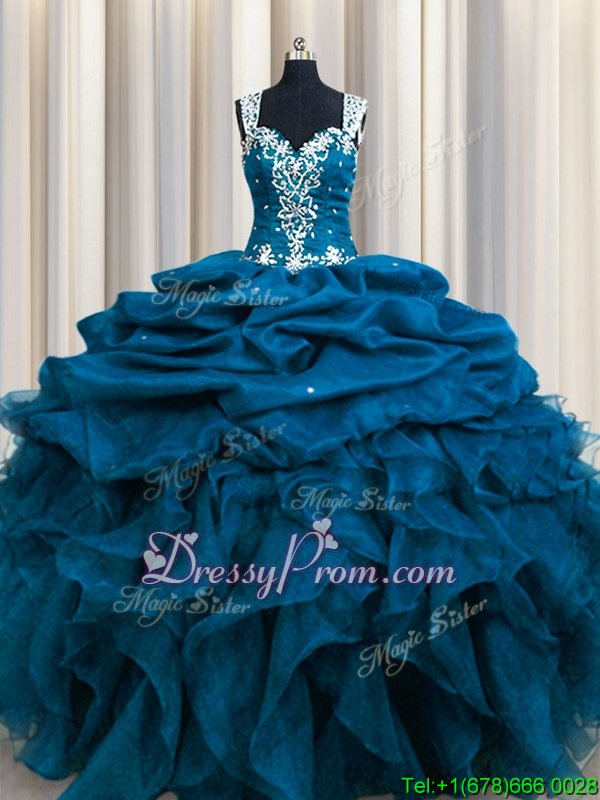 Neckline : StrapsShown Color : Teal Silhouette : Ball GownsSleeve Length : sleevelessHemline : floor lengthBack Detail : ZipperFabric : OrganzaEmbellishment : Beading,Ruffles,SequinsOccasion : Military Ball,Sweet 16,QuinceaneraSeason : Spring,Summer,Fall,Winter