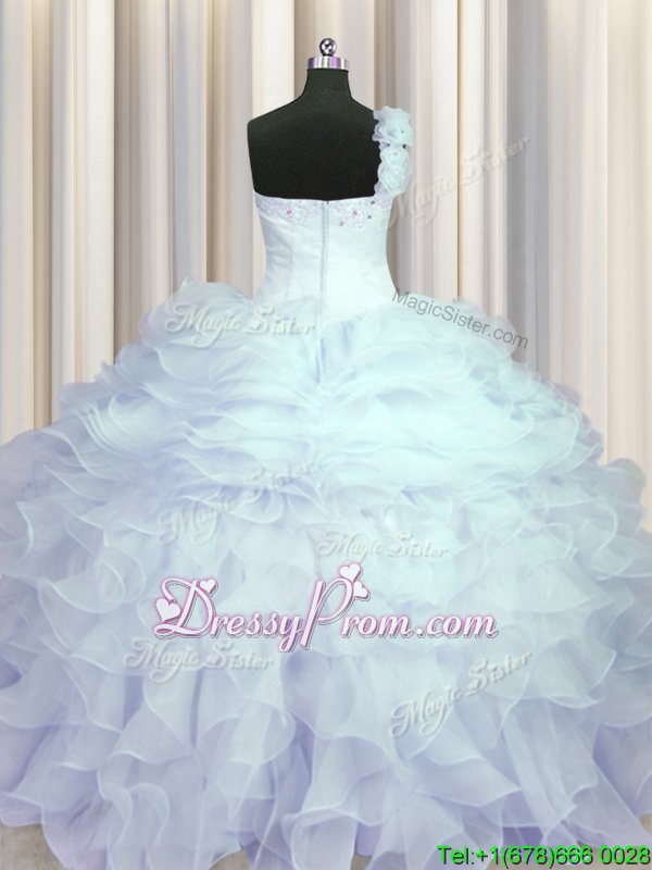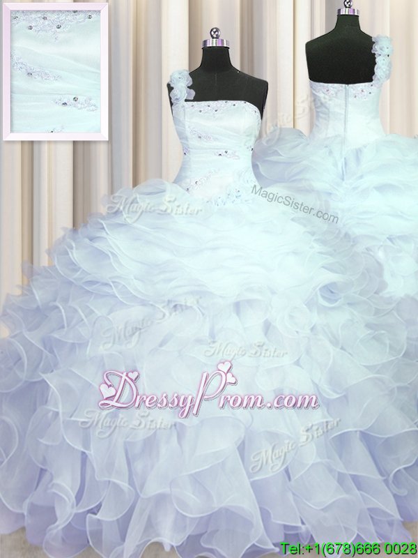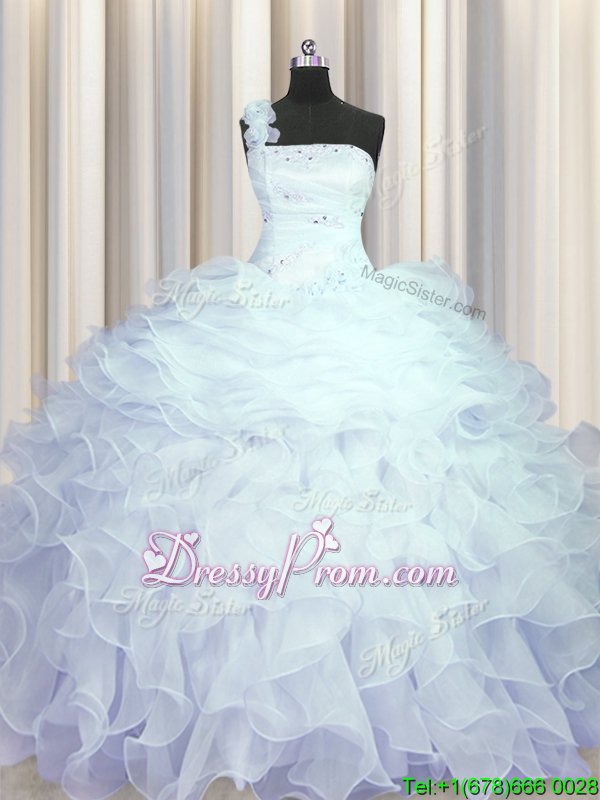 Neckline : One shoulderShown Color : Light BlueSilhouette : Ball GownsSleeve Length : sleevelessHemline : floor lengthBack Detail : ZipperFabric : OrganzaEmbellishment : Beading,RufflesOccasion : Military Ball,Sweet 16,QuinceaneraSeason : Spring,Summer,Fall,Winter