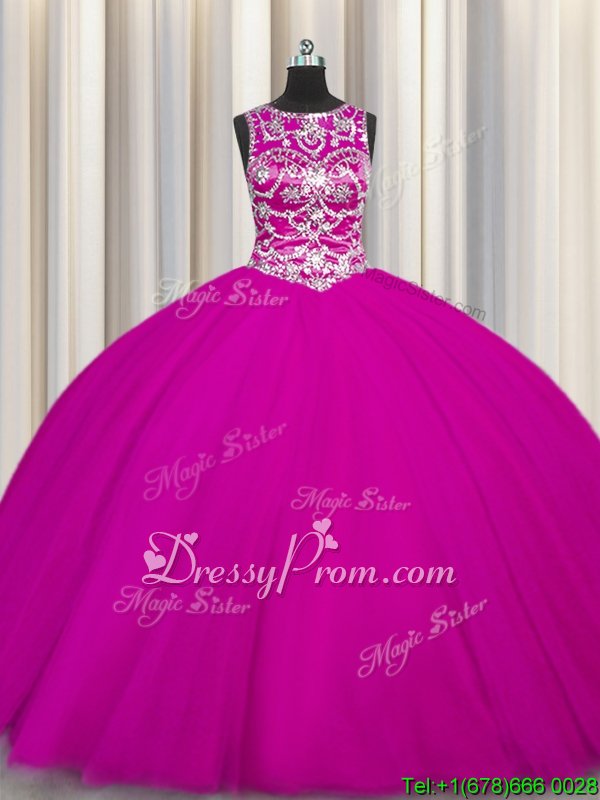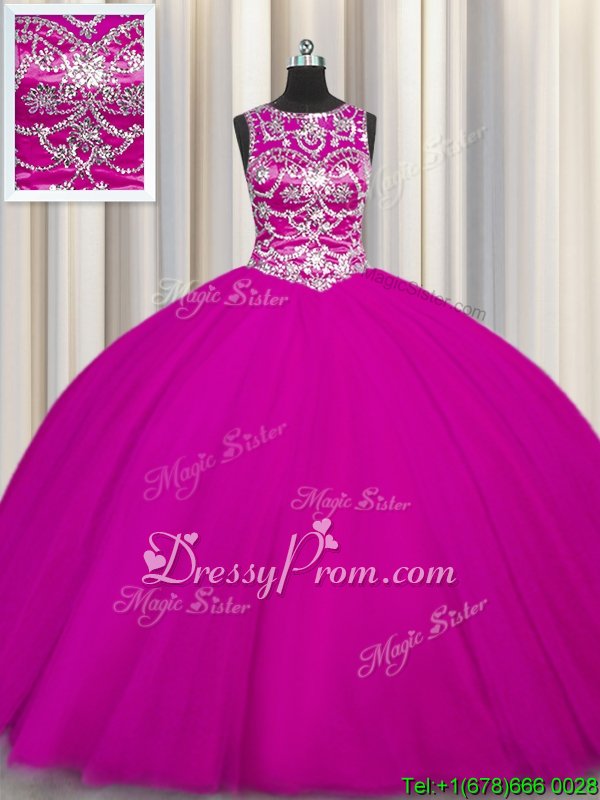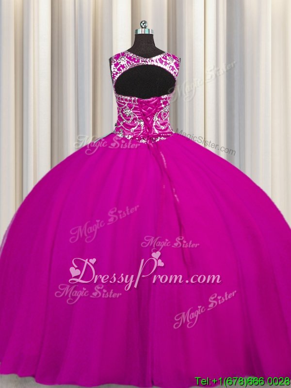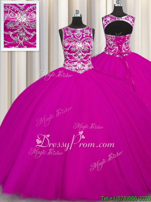 Neckline : ScoopShown Color : FuchsiaSilhouette : Ball GownsSleeve Length : sleevelessHemline : floor lengthBack Detail : Lace upFabric : TulleEmbellishment : Beading,AppliquesOccasion : Military Ball,Sweet 16,QuinceaneraSeason : Spring,Summer,Fall,Winter