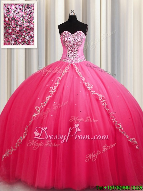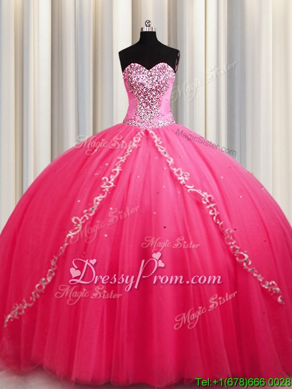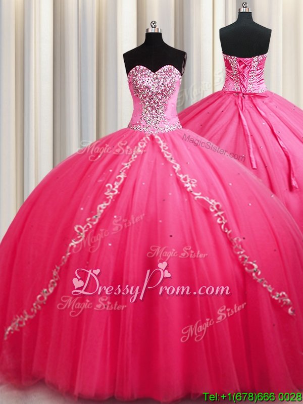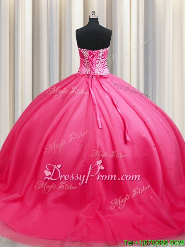 Neckline : SweetheartShown Color : Hot PinkSilhouette : Ball GownsSleeve Length : sleevelessHemline : with trainBack Detail : Lace upFabric : TulleEmbellishment : BeadingOccasion : Military Ball,Sweet 16,QuinceaneraSeason : Spring,Summer,Fall,Winter