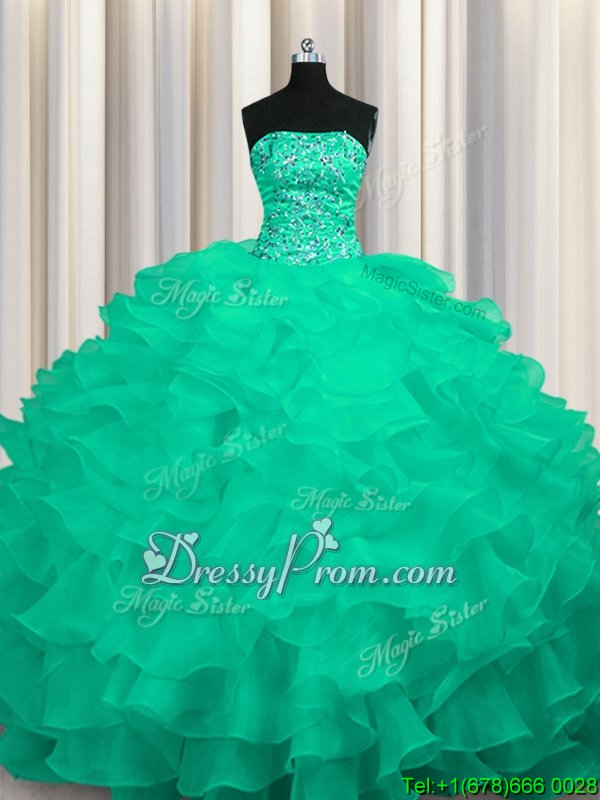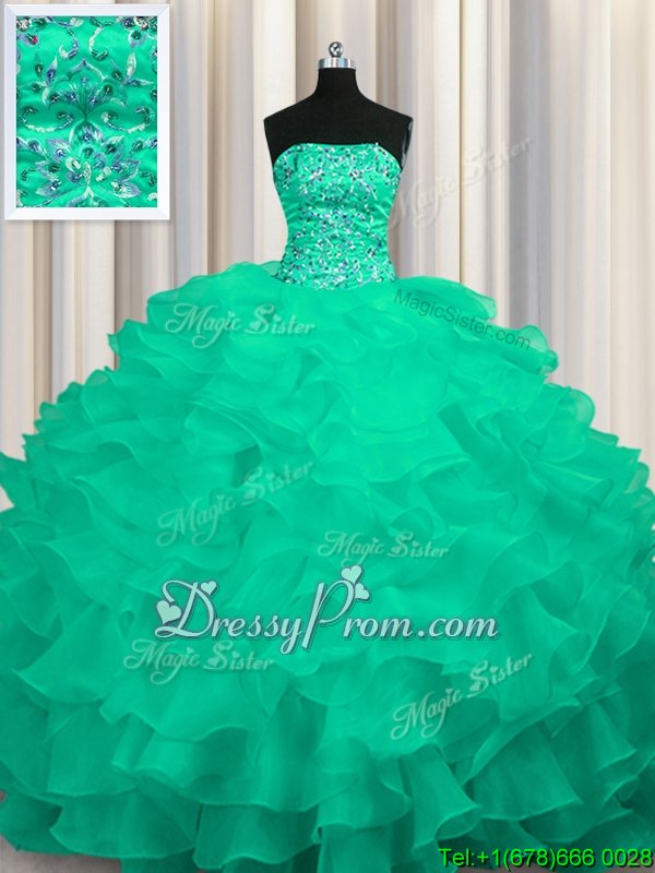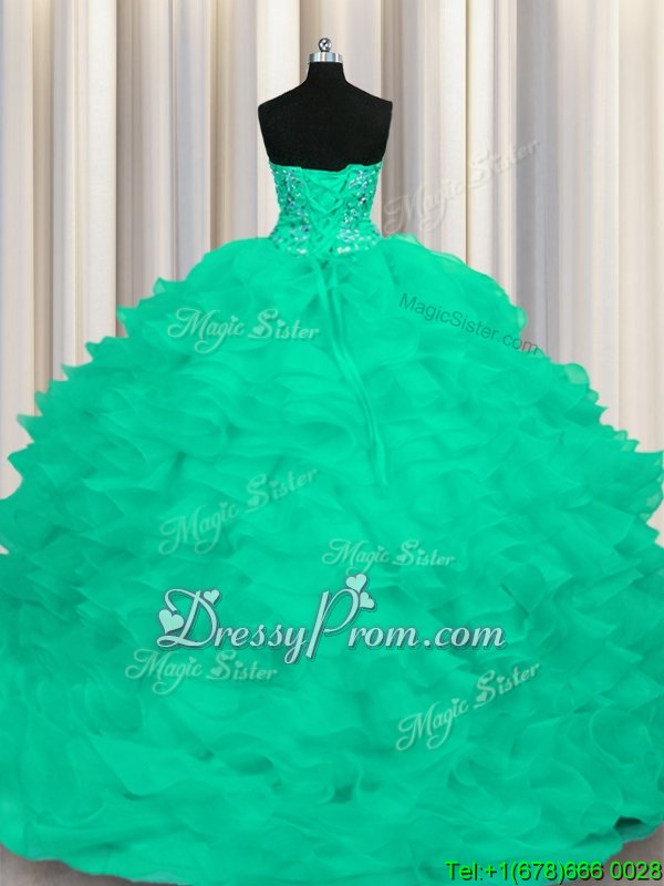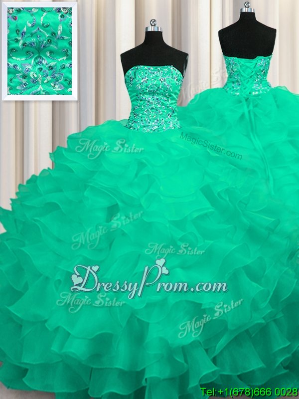 Neckline : StraplessShown Color : TurquoiseSilhouette : Ball GownsSleeve Length : sleevelessHemline : with trainBack Detail : Lace upFabric : OrganzaEmbellishment : Beading,RufflesOccasion : Military Ball,Sweet 16,QuinceaneraSeason : Spring,Summer,Fall,Winter
