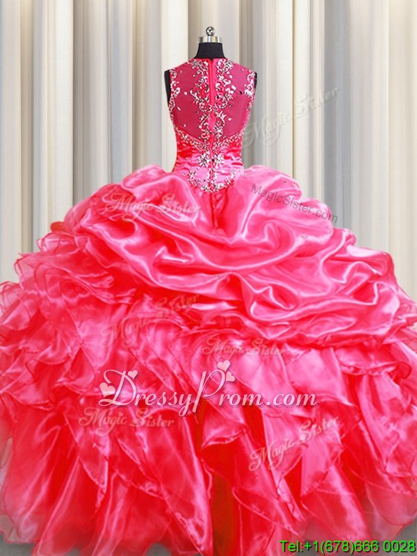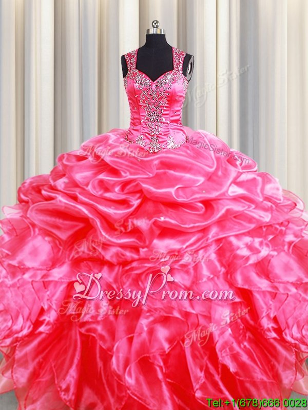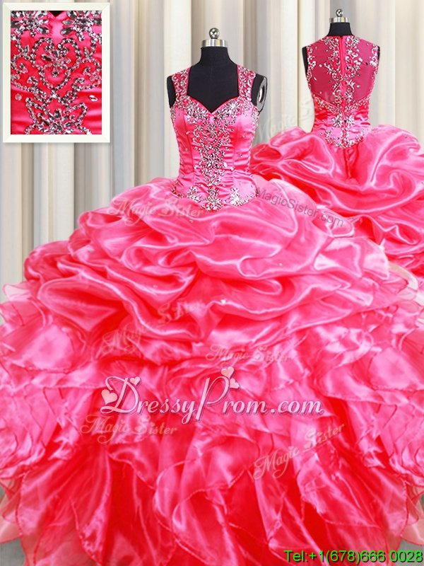 Neckline : StrapsShown Color : Hot PinkSilhouette : Ball GownsSleeve Length : sleevelessHemline : floor lengthBack Detail : ZipperFabric : OrganzaEmbellishment : Beading,Ruffles,Pick UpsOccasion : Military Ball,Sweet 16,QuinceaneraSeason : Spring,Summer,Fall,Winter