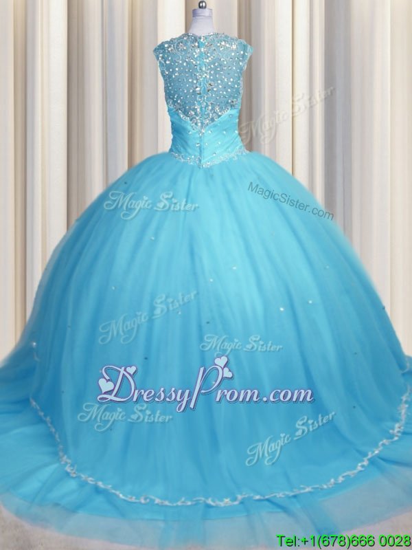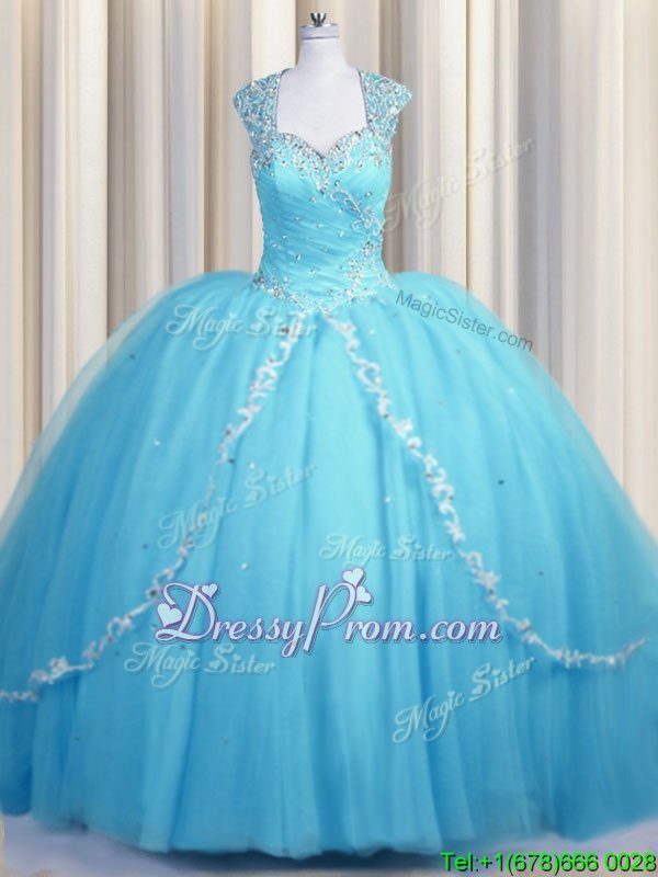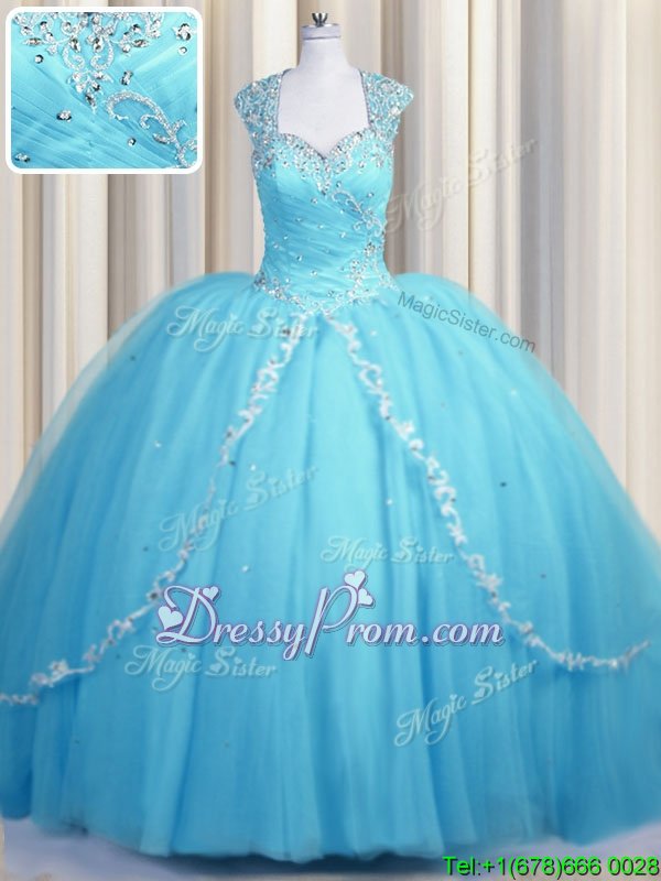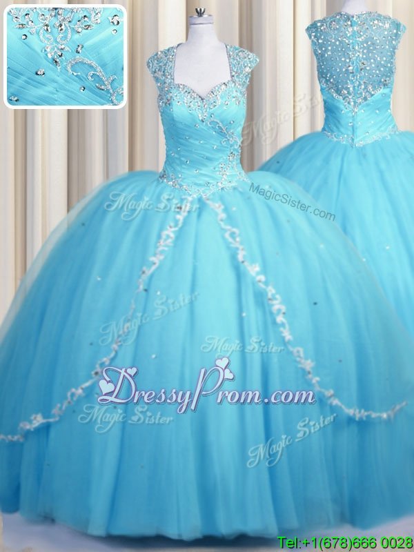 Neckline : SweetheartShown Color : Baby BlueSilhouette : Ball GownsSleeve Length : cap sleevesHemline : with trainBack Detail : ZipperFabric : TulleEmbellishment : Beading,AppliquesOccasion : Military Ball,Sweet 16,QuinceaneraSeason : Spring,Summer,Fall,Winter