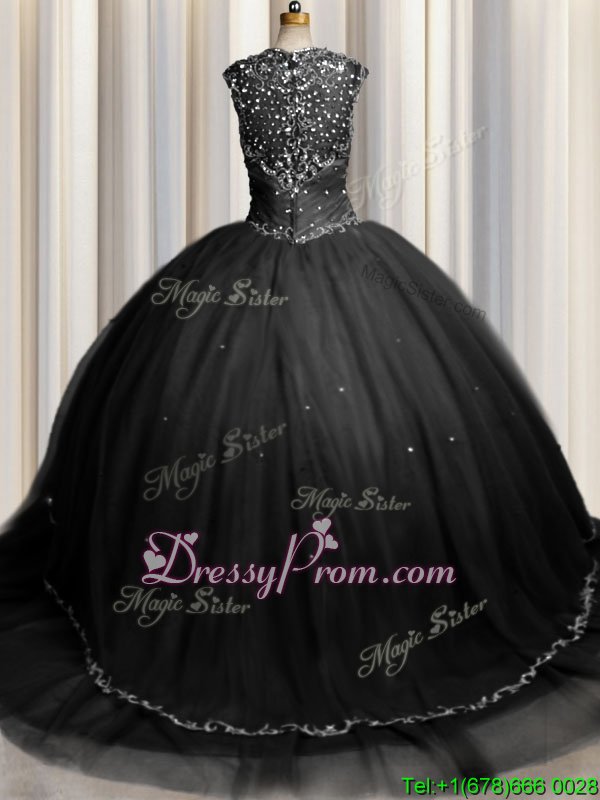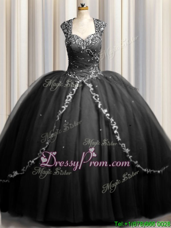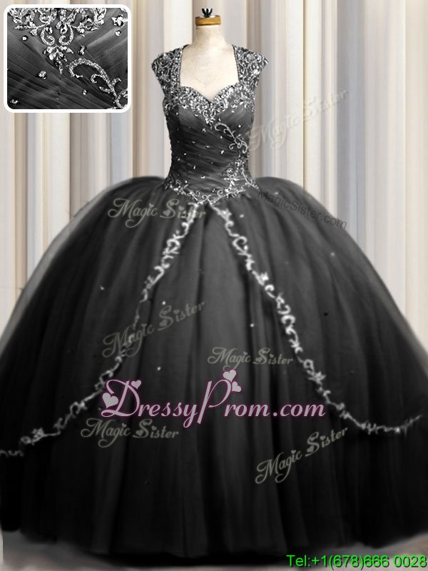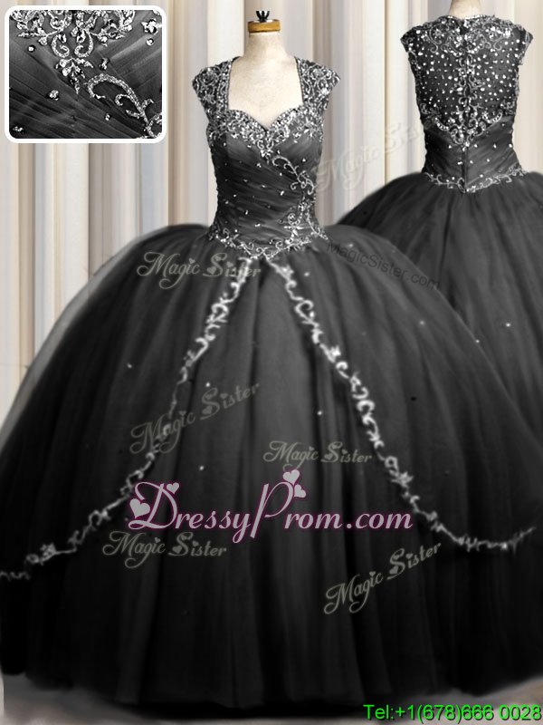 Neckline : SweetheartShown Color : BlackSilhouette : Ball GownsSleeve Length : cap sleevesHemline : with trainBack Detail : ZipperFabric : TulleEmbellishment : Beading,AppliquesOccasion : Military Ball,Sweet 16,QuinceaneraSeason : Spring,Summer,Fall,Winter