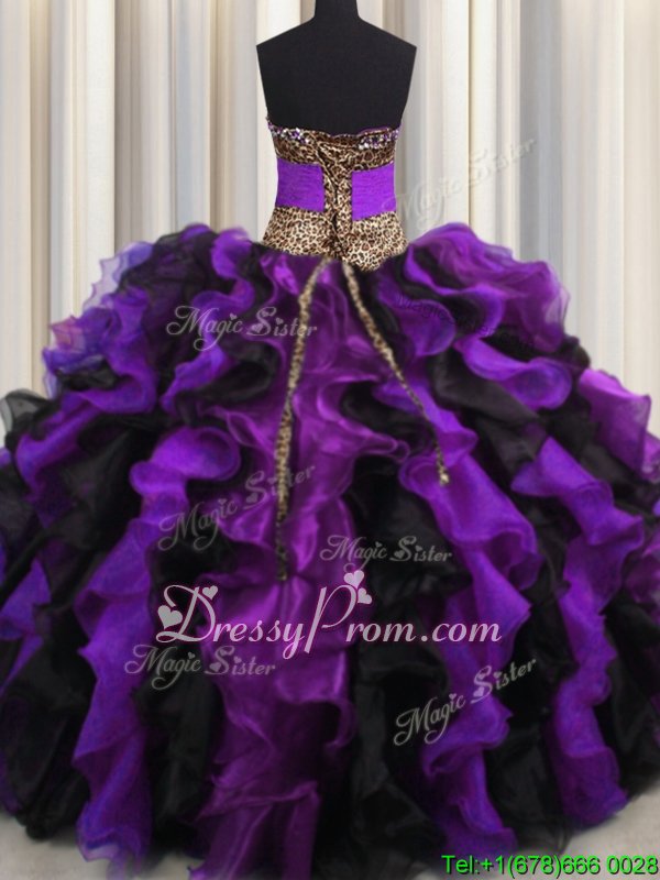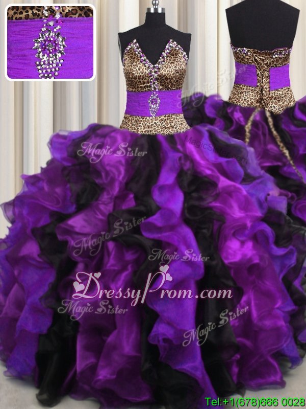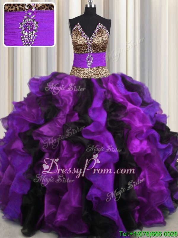 Nice Multi-color V-neck Neckline Beading and Ruffles Sweet 16 Dress Sleeveless Lace Up