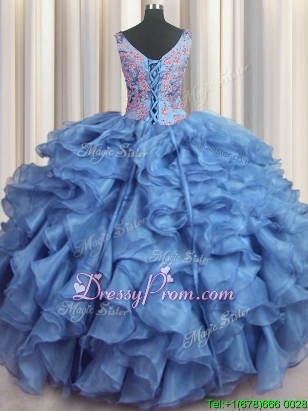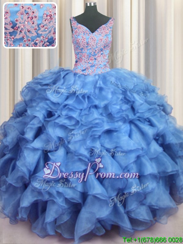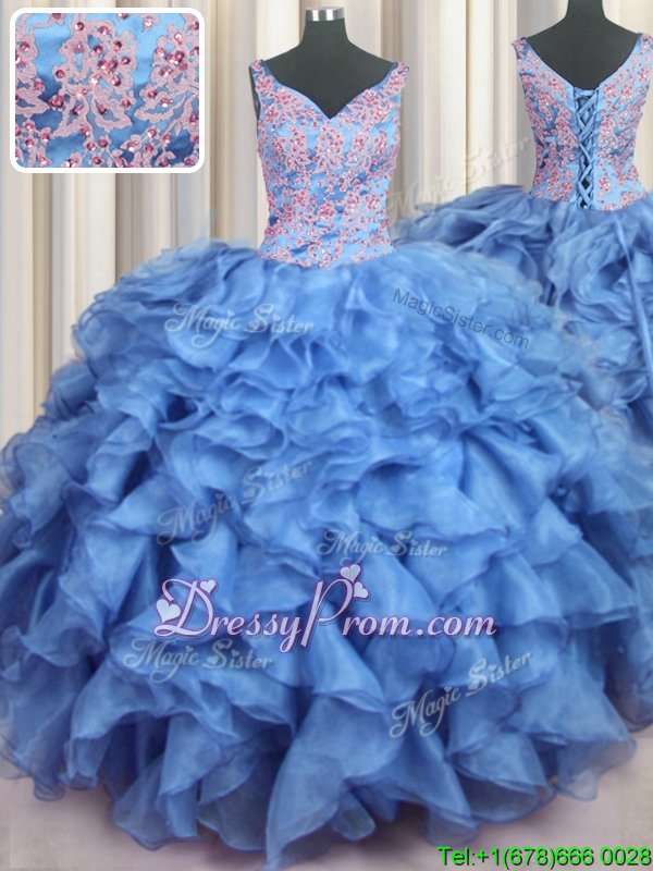 Neckline : V-neckShown Color : Baby BlueSilhouette : Ball GownsSleeve Length : sleevelessHemline : floor lengthBack Detail : Lace upFabric : OrganzaEmbellishment : Appliques,Ruffled LayersOccasion : Military Ball,Sweet 16,QuinceaneraSeason : Spring,Summer,Fall,Winter