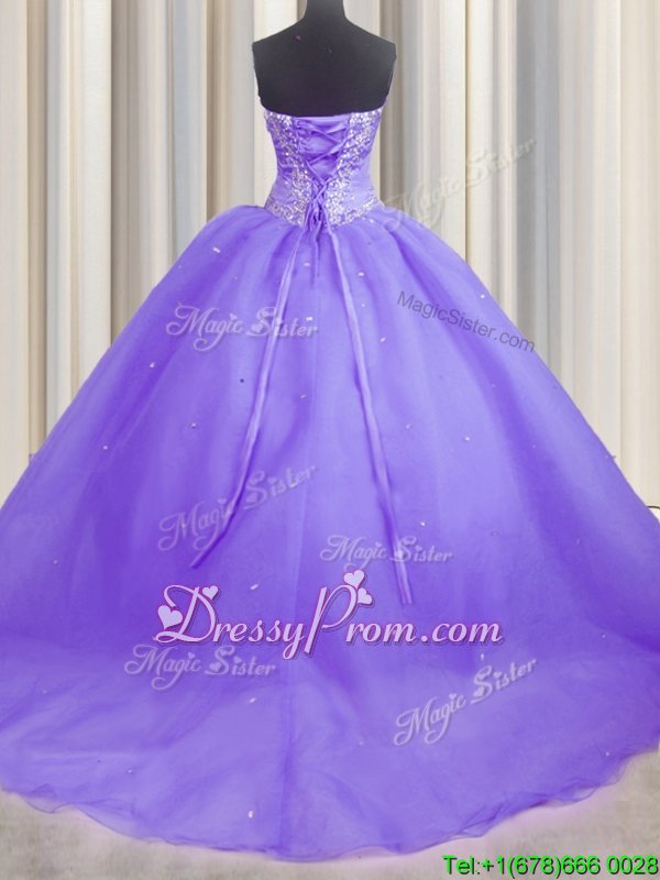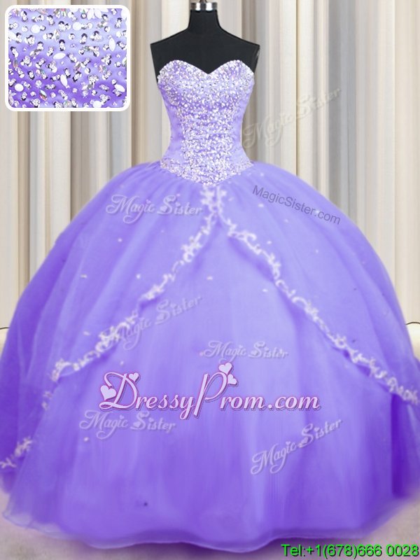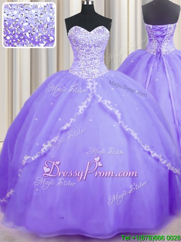 Neckline : SweetheartShown Color : LavenderSilhouette : Ball GownsSleeve Length : sleevelessHemline : with trainBack Detail : Lace upFabric : OrganzaEmbellishment : Beading,AppliquesOccasion : Military Ball,Sweet 16,QuinceaneraSeason : Spring,Summer,Fall,Winter