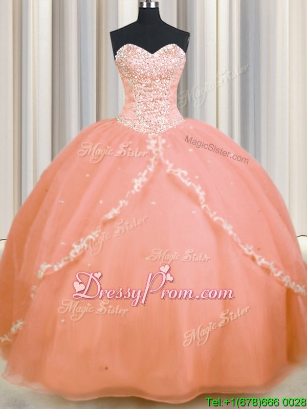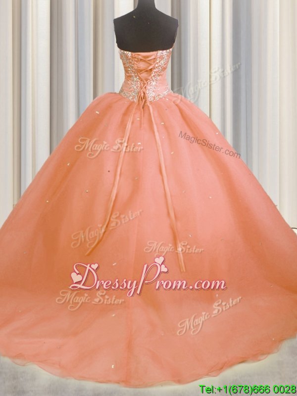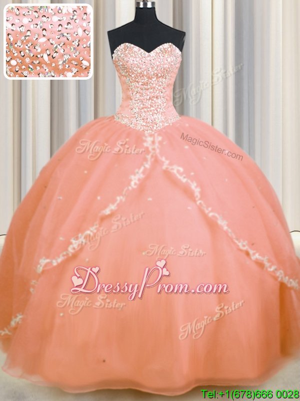 Neckline : SweetheartShown Color : OrangeSilhouette : Ball GownsSleeve Length : sleevelessHemline : with trainBack Detail : Lace upFabric : OrganzaEmbellishment : Beading,AppliquesOccasion : Military Ball,Sweet 16,QuinceaneraSeason : Spring,Summer,Fall,Winter