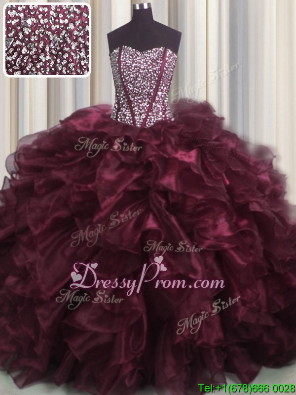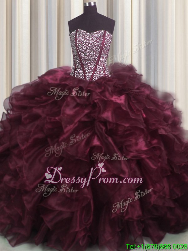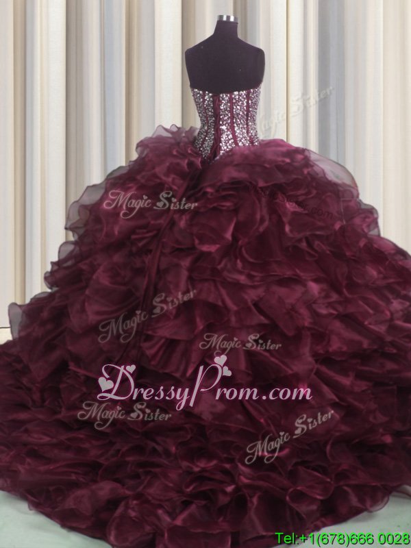 Neckline : SweetheartShown Color : BurgundySilhouette : Ball GownsSleeve Length : sleevelessHemline : with trainBack Detail : Lace upFabric : OrganzaEmbellishment : Beading,RufflesOccasion : Military Ball,Sweet 16,QuinceaneraSeason : Spring,Summer,Fall,Winter