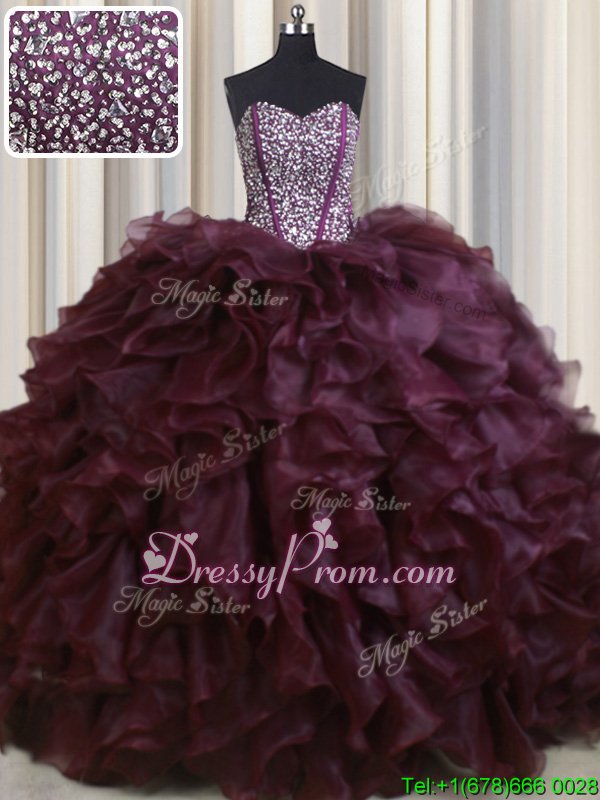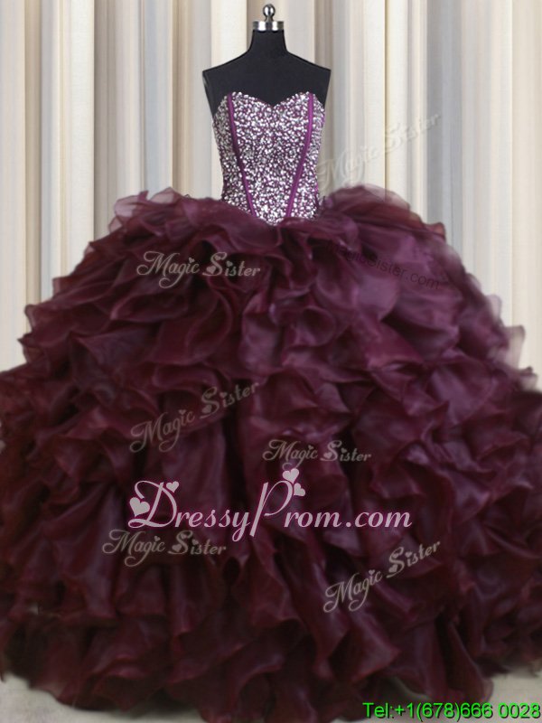 Neckline : SweetheartShown Color : BurgundySilhouette : Ball GownsSleeve Length : sleevelessHemline : with trainBack Detail : Lace upFabric : OrganzaEmbellishment : Beading,RufflesOccasion : Military Ball,Sweet 16,QuinceaneraSeason : Spring,Summer,Fall,Winter