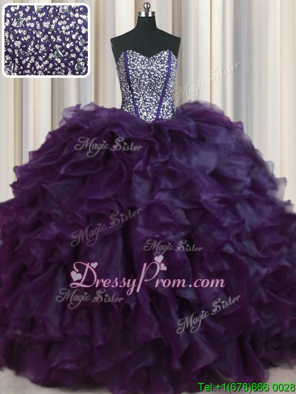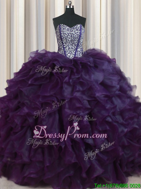 Neckline : SweetheartShown Color : Eggplant PurpleSilhouette : Ball GownsSleeve Length : sleevelessHemline : with trainBack Detail : Lace upFabric : OrganzaEmbellishment : Beading,RufflesOccasion : Military Ball,Sweet 16,QuinceaneraSeason : Spring,Summer,Fall,Winter