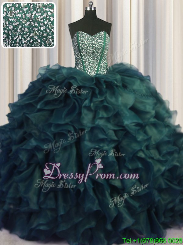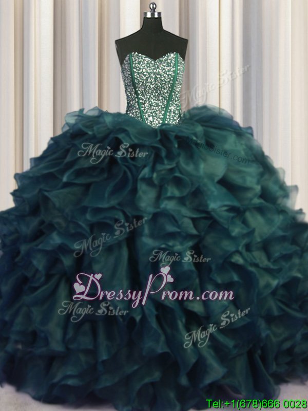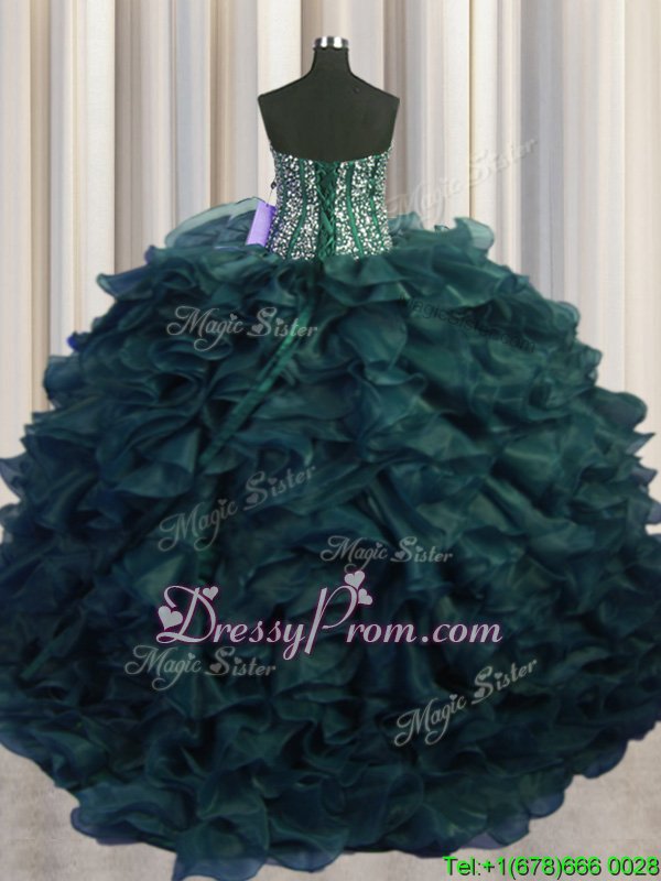Neckline : SweetheartShown Color : Peacock GreenSilhouette : Ball GownsSleeve Length : sleevelessHemline : with trainBack Detail : Lace upFabric : OrganzaEmbellishment : Beading,RufflesOccasion : Military Ball,Sweet 16,QuinceaneraSeason : Spring,Summer,Fall,Winter