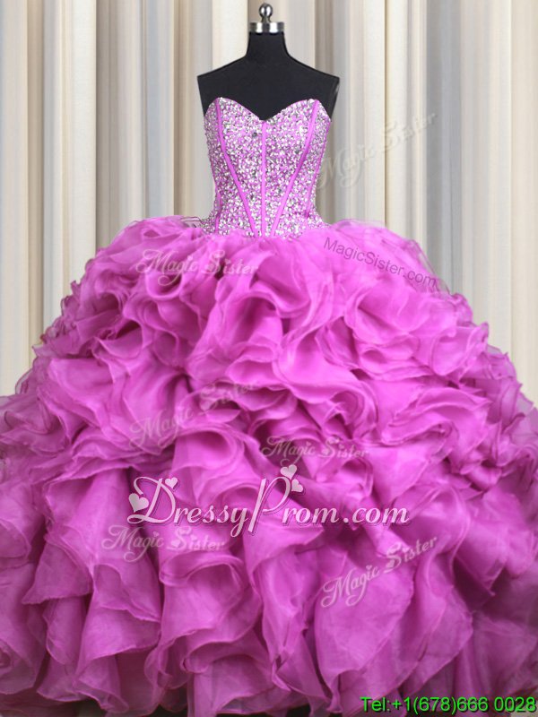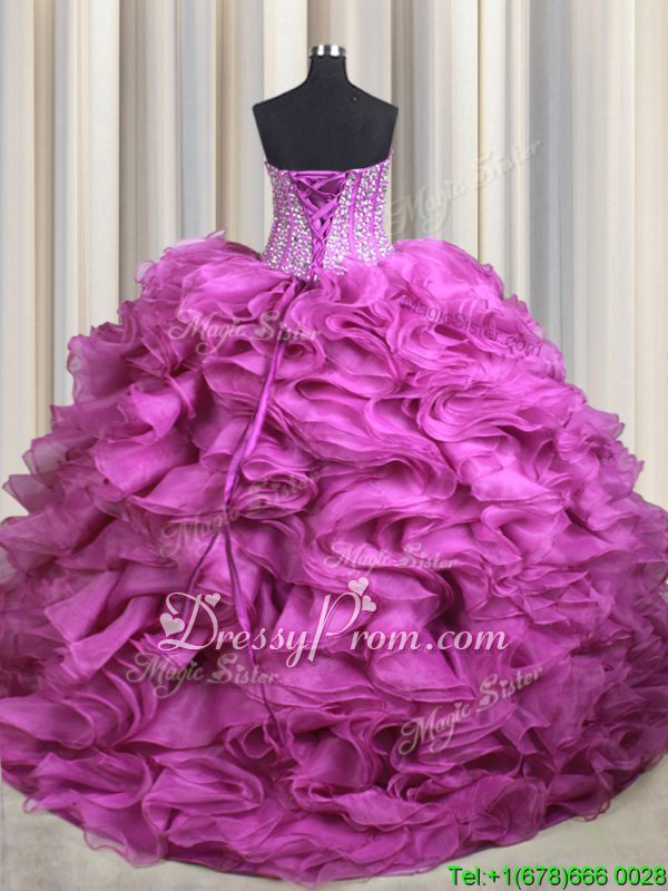 Neckline : SweetheartShown Color : FuchsiaSilhouette : Ball GownsSleeve Length : sleevelessHemline : with trainBack Detail : Lace upFabric : OrganzaEmbellishment : Beading,RufflesOccasion : Military Ball,Sweet 16,QuinceaneraSeason : Spring,Summer,Fall,Winter