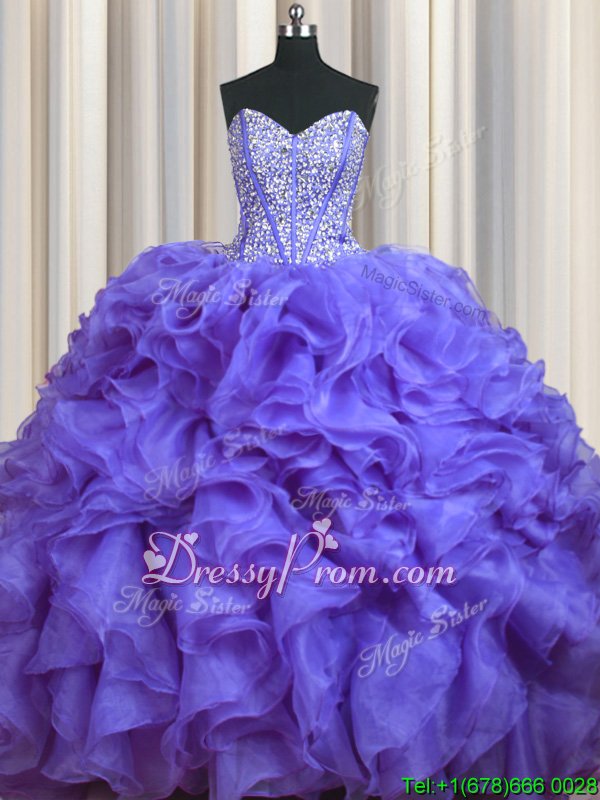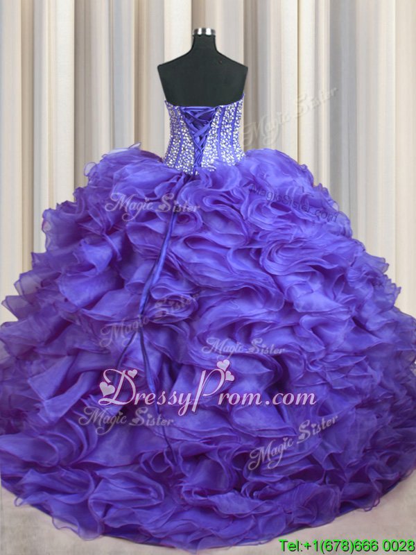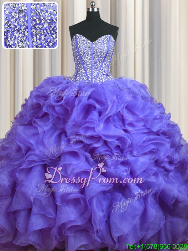 Neckline : SweetheartShown Color : LavenderSilhouette : Ball GownsSleeve Length : sleevelessHemline : with trainBack Detail : Lace upFabric : OrganzaEmbellishment : Beading,RufflesOccasion : Military Ball,Sweet 16,QuinceaneraSeason : Spring,Summer,Fall,Winter