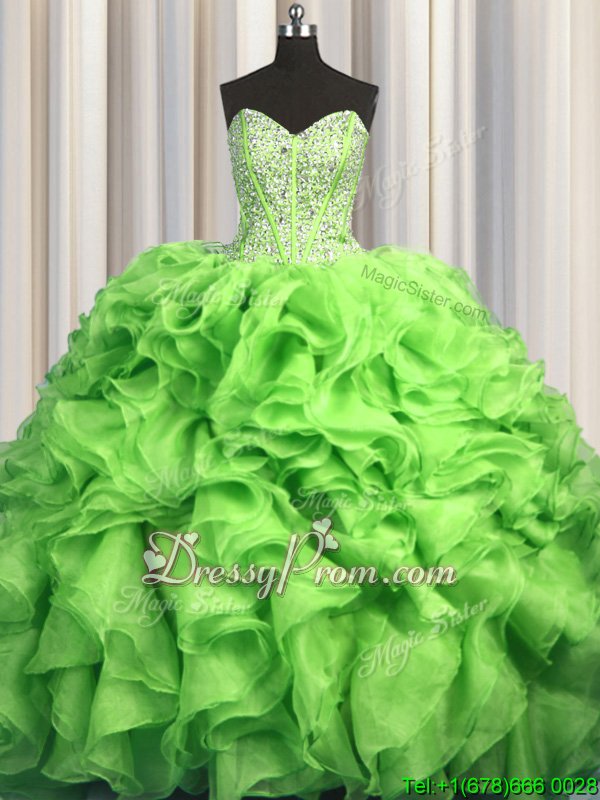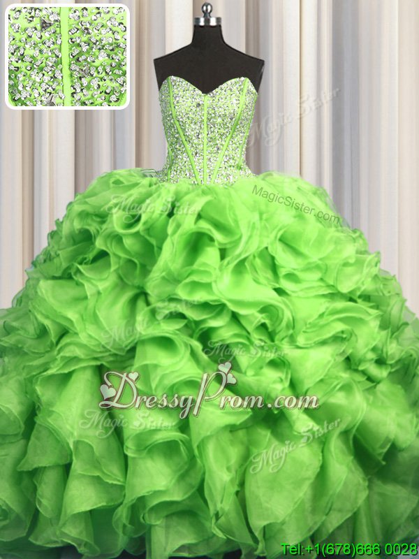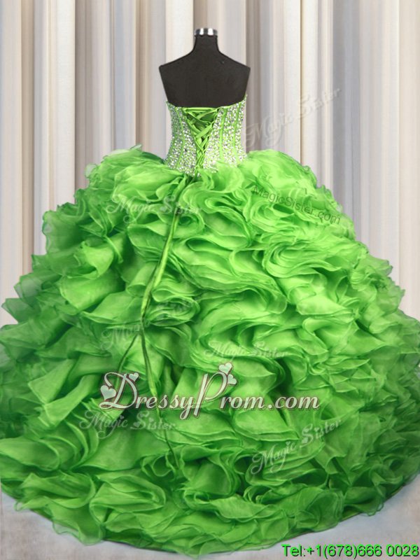 Neckline : SweetheartShown Color : Yellow GreenSilhouette : Ball GownsSleeve Length : sleevelessHemline : with trainBack Detail : Lace upFabric : OrganzaEmbellishment : Beading,RufflesOccasion : Military Ball,Sweet 16,QuinceaneraSeason : Spring,Summer,Fall,Winter