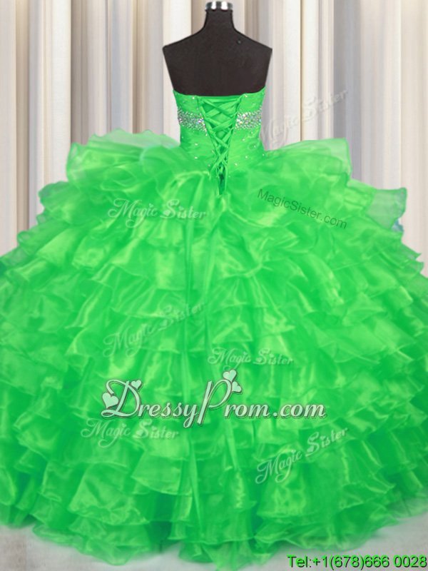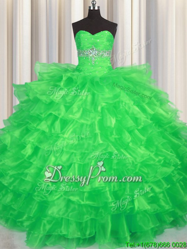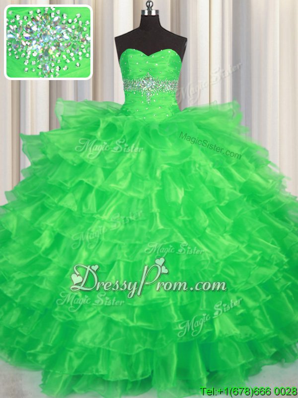 Neckline : SweetheartShown Color : GreenSilhouette : Ball GownsSleeve Length : sleevelessHemline : floor lengthBack Detail : Lace upFabric : OrganzaEmbellishment : Beading,Ruffled LayersOccasion : Military Ball,Sweet 16,QuinceaneraSeason : Spring,Summer,Fall,Winter
