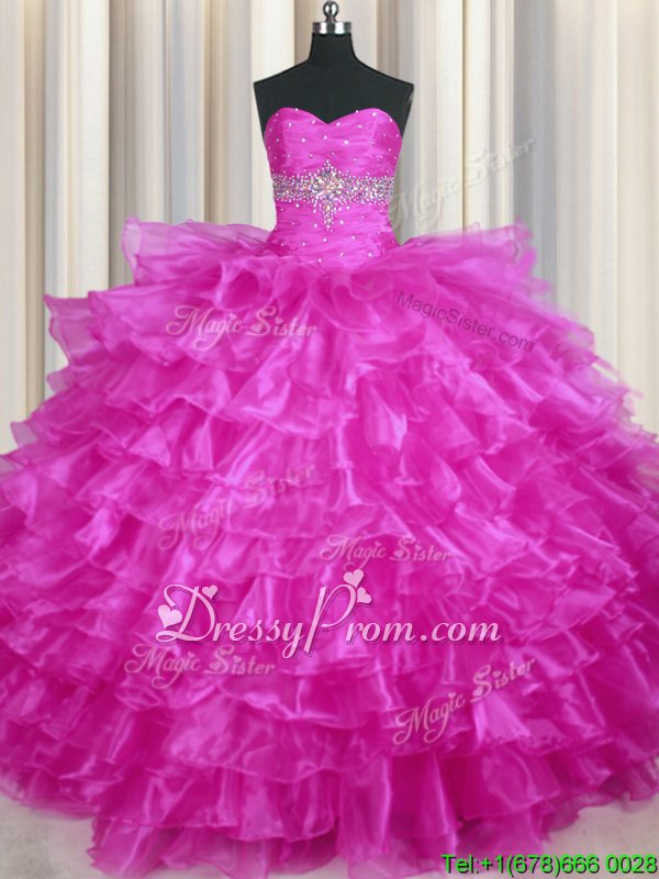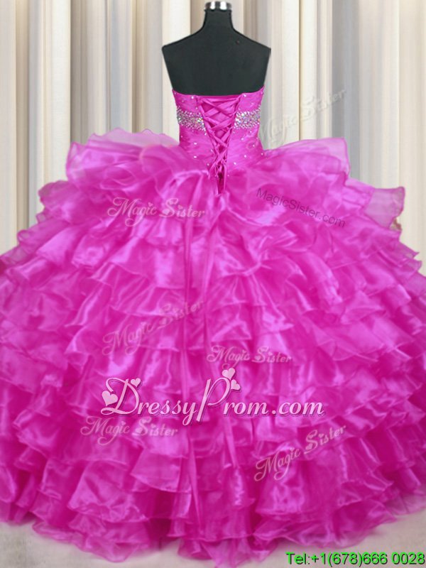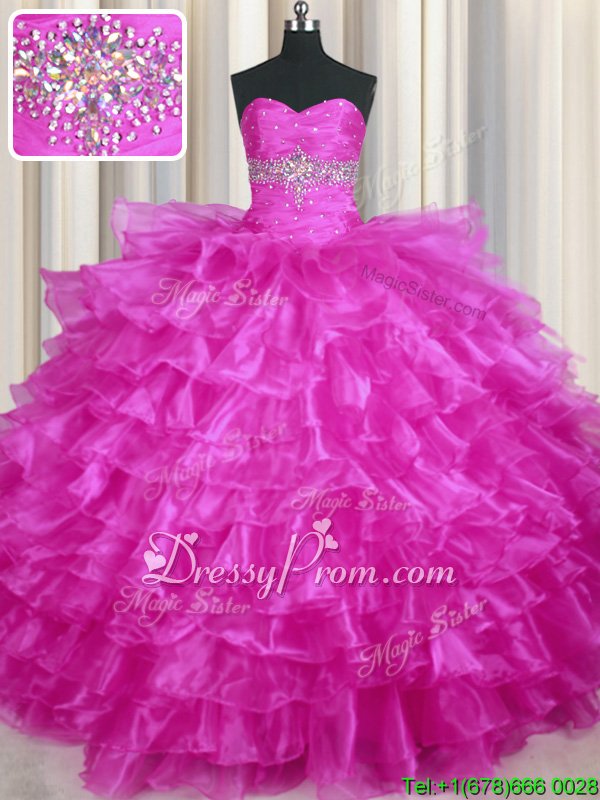 Neckline : SweetheartShown Color : FuchsiaSilhouette : Ball GownsSleeve Length : sleevelessHemline : floor lengthBack Detail : Lace upFabric : OrganzaEmbellishment : Beading,Ruffled LayersOccasion : Military Ball,Sweet 16,QuinceaneraSeason : Spring,Summer,Fall,Winter