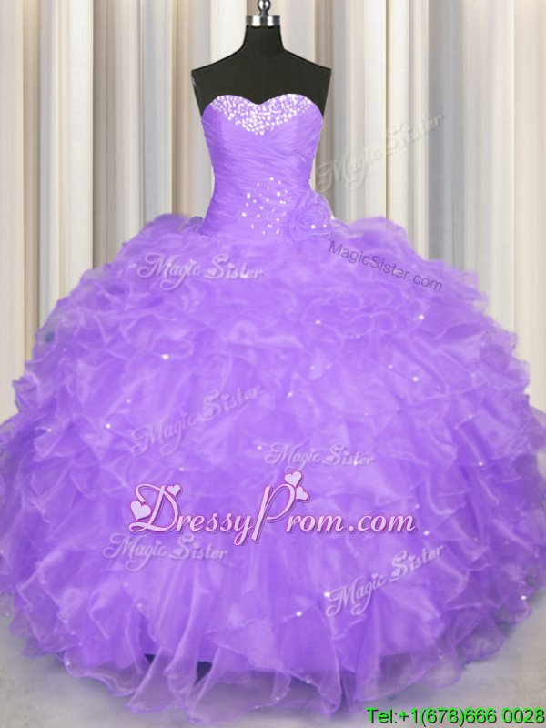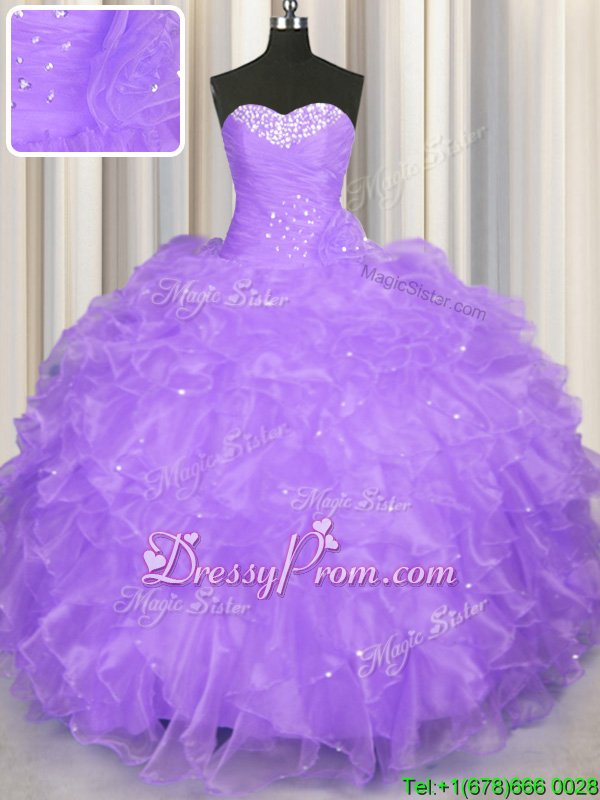 Neckline : SweetheartShown Color : LavenderSilhouette : Ball GownsSleeve Length : sleevelessHemline : floor lengthBack Detail : Lace upFabric : OrganzaEmbellishment : Beading,RufflesOccasion : Military Ball,Sweet 16,QuinceaneraSeason : Spring,Summer,Fall,Winter