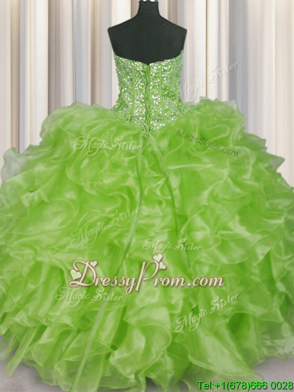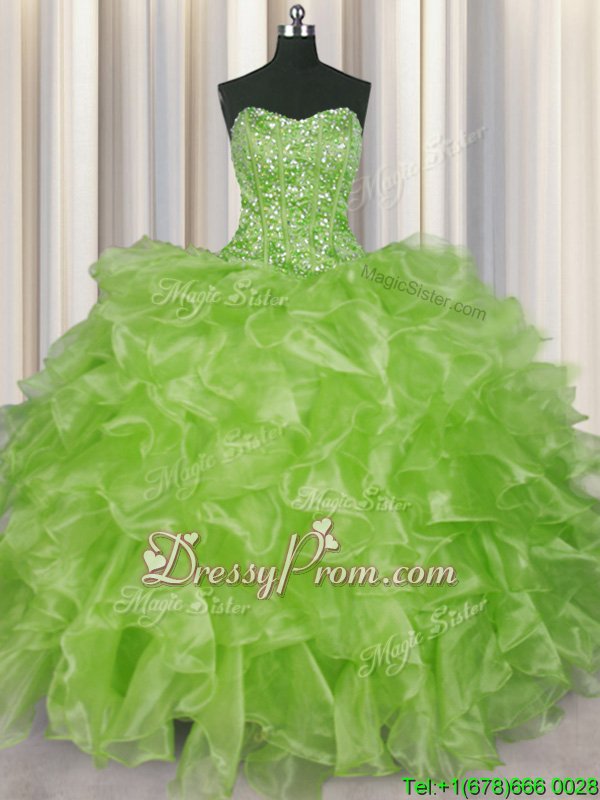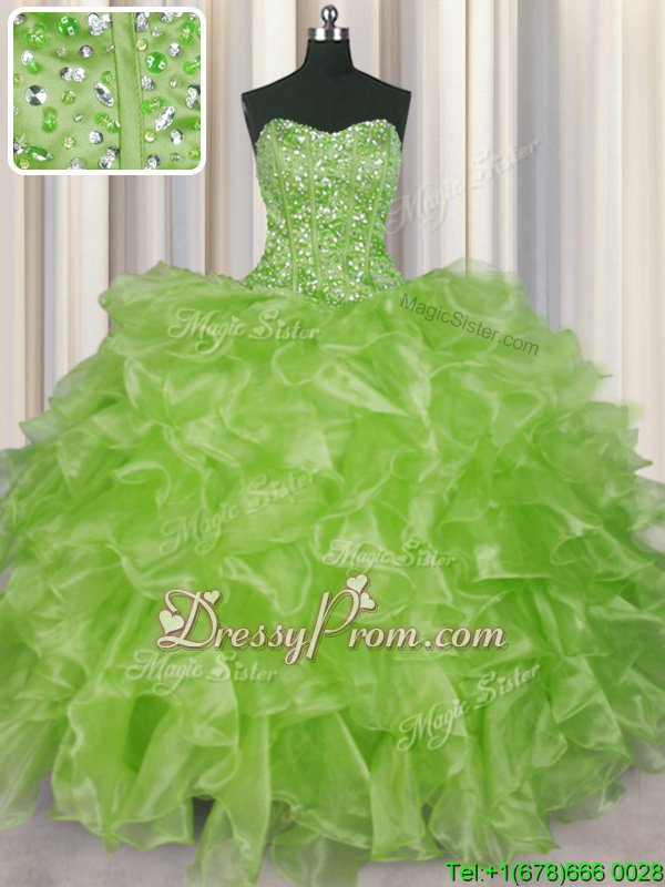 Neckline : StraplessShown Color : Yellow GreenSilhouette : Ball GownsSleeve Length : sleevelessHemline : floor lengthBack Detail : Lace upFabric : OrganzaEmbellishment : Beading,RufflesOccasion : Military Ball,Sweet 16,QuinceaneraSeason : Spring,Summer,Fall,Winter
