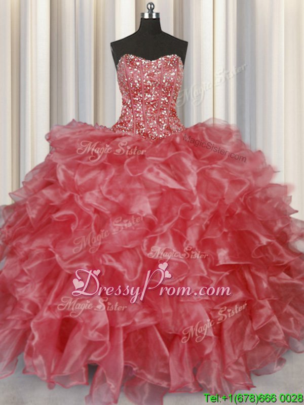 Neckline : StraplessShown Color : Coral RedSilhouette : Ball GownsSleeve Length : sleevelessHemline : floor lengthBack Detail : Lace upFabric : OrganzaEmbellishment : Beading,RufflesOccasion : Military Ball,Sweet 16,QuinceaneraSeason : Spring,Summer,Fall,Winter