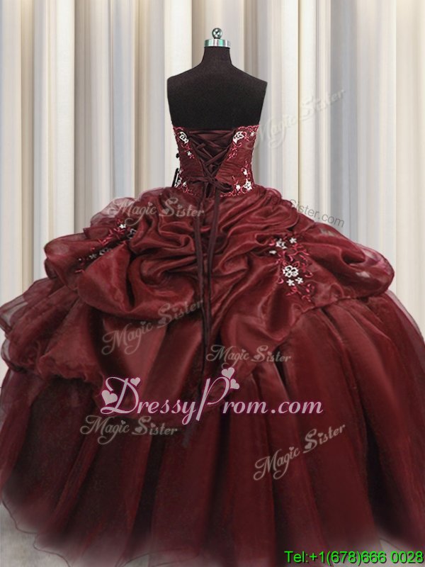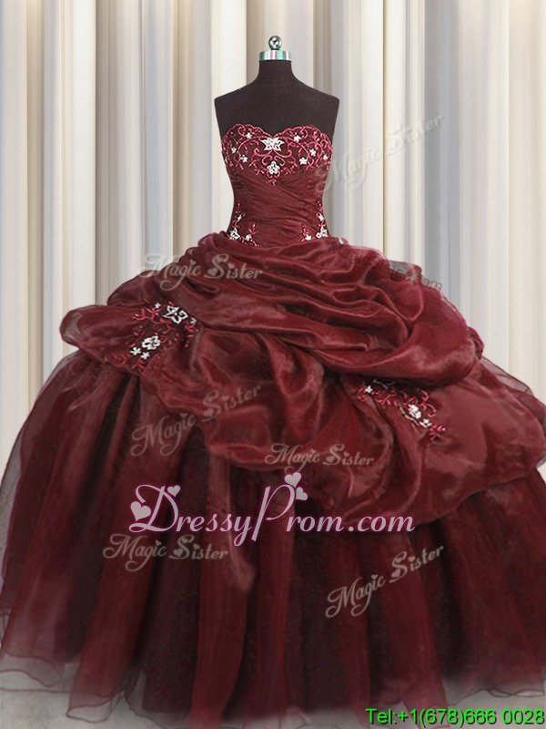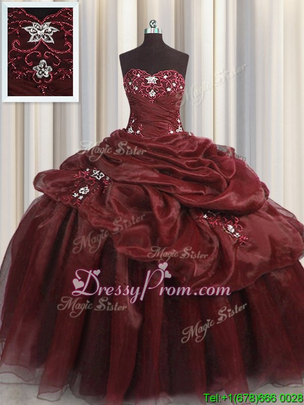 Neckline : SweetheartShown Color : BurgundySilhouette : Ball GownsSleeve Length : sleevelessHemline : floor lengthBack Detail : Lace upFabric : OrganzaEmbellishment : Beading,Appliques,Pick UpsOccasion : Military Ball,Sweet 16,QuinceaneraSeason : Spring,Summer,Fall,Winter