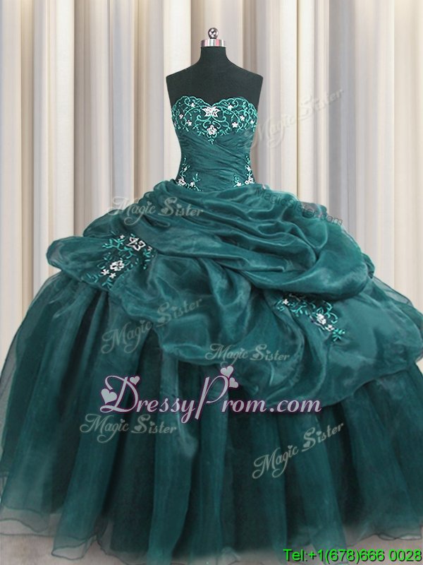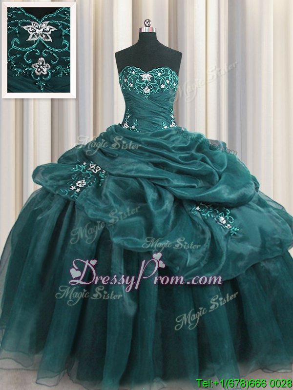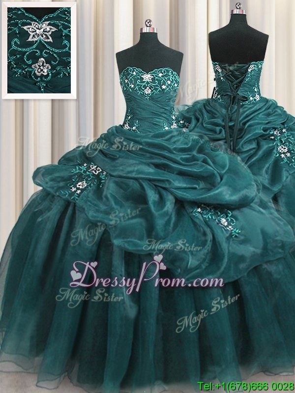 Neckline : SweetheartShown Color : Teal Silhouette : Ball GownsSleeve Length : sleevelessHemline : floor lengthBack Detail : Lace upFabric : OrganzaEmbellishment : Beading,Appliques,RufflesOccasion : Military Ball,Sweet 16,QuinceaneraSeason : Spring,Summer,Fall,Winter