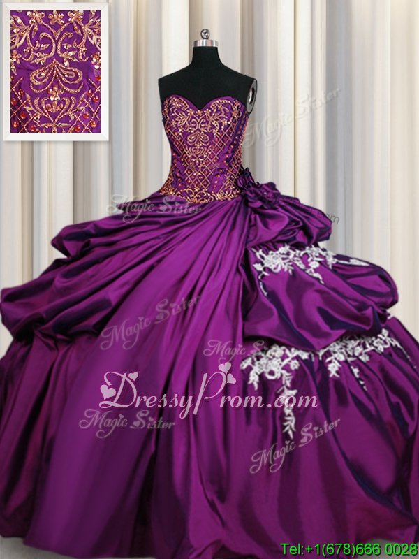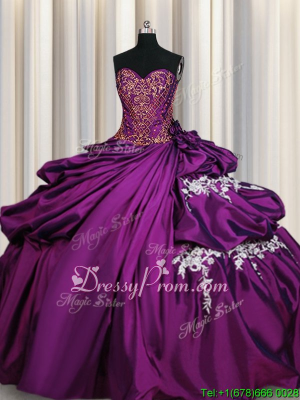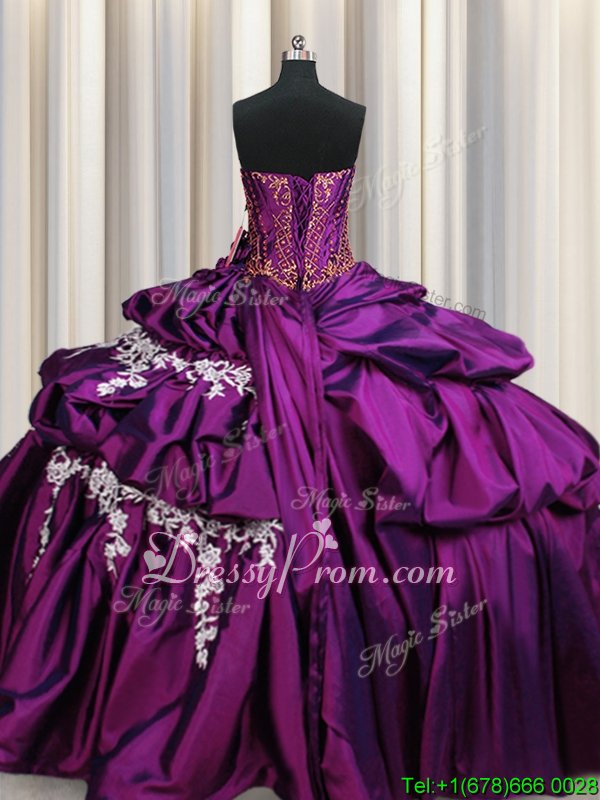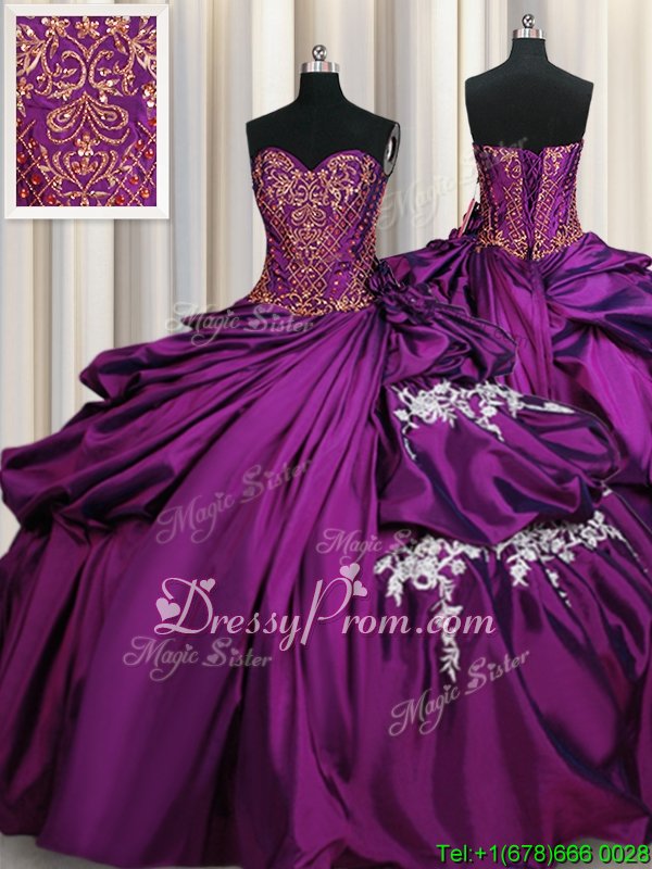 Neckline : SweetheartShown Color : PurpleSilhouette : Ball GownsSleeve Length : sleevelessHemline : floor lengthBack Detail : Lace upFabric : TaffetaEmbellishment : Beading,AppliquesOccasion : Military Ball,Sweet 16,QuinceaneraSeason : Spring,Summer,Fall,Winter