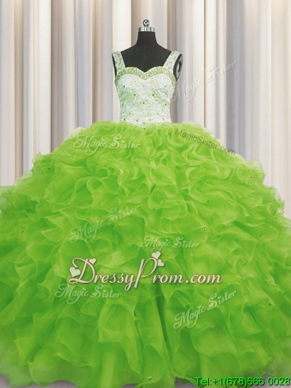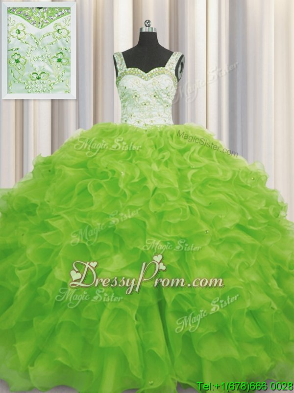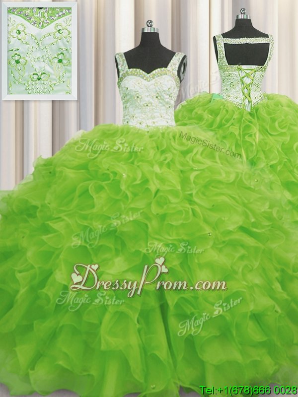 Neckline : StrapsShown Color : Yellow GreenSilhouette : Ball GownsSleeve Length : sleevelessHemline : floor lengthBack Detail : Lace upFabric : OrganzaEmbellishment : Beading,RufflesOccasion : Military Ball,Sweet 16,QuinceaneraSeason : Spring,Summer,Fall,Winter