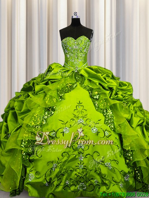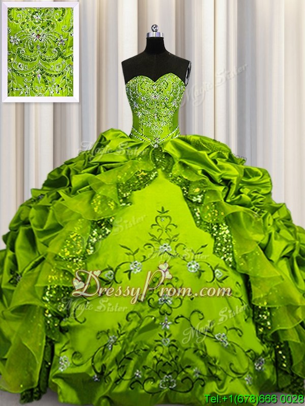 Neckline : SweetheartShown Color : Olive GreenSilhouette : Ball GownsSleeve Length : sleevelessHemline : floor lengthBack Detail : Lace upFabric : TaffetaEmbellishment : Beading,Embroidery,Ruffles,Pick UpsOccasion : Military Ball,Sweet 16,QuinceaneraSeason : Spring,Summer,Fall,Winter